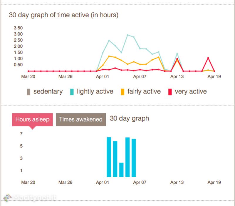 Una delle particolarità dei dispositivi per il fitness come il FitBit è la misurazione della qualità del sonno. Questa funzione è svolta anche dal FitBit che può essere indossato durante la notte usando un bracciale (che abbiamo trovato molto leggero e comodo) dotato di una tasca semitrasparente all’interno della quale si colloca il FitBit. Appena decidiamo che è tempo di prendere sonno, premeremo per un paio di secondi il tasto del FitBit che si metterà in stand by. Quando ci sveglieremo, premeremo di nuovo lo stesso tasto così che faremo sapere al FitBit che ci stiamo alzando. I dati del sonno, che siano ore dormite e numero di risvegli, verranno presentati alla sincronizzazione del FitBit. Per quanto riguarda che cosa FitBit One deve considerare un risveglio, è possibile, usando il sito, selezionare la sensibilità del FitBit One così da farlo adeguare sia alle persone che di notte sono più tranquille che quelle che sono più turbolente. È bene precisare che la validità scientifica della misurazione della qualità del sonno così come essa viene stabilita dal FitBit è discuTitibile visto che dipende solo parzialmente da quanto ci muoviamo e quante volte ci alziamo e questo è invece quel che analizza l’accessorio. In ogni caso FitBit One è in grado di dirci quanto tempo siamo stati a letto e quanto ci siamo agitati durante la notte. Oltre a questo ha anche una funzione di sveglia integrata a vibrazione che, in base all’ora da noi prefissata, serve a farci sapere che è giunto il momento di alzarsi senza disturbare chi dorme accanto a noi; il motore a vibrazione è discreto ma perfettamente in grado di svegliarci.