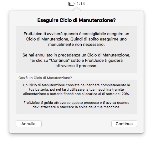 Al centro del funzionamento di FruitJuice c’è ovviamente il fatto che l’app deve essere abilitata per venir avviata all’accensione della macchina e girare sempre. Dopodiché permette di avere una visione piuttosto chiara su alcuni parametri informativi fondamentali per la vita della batteria e per il suo uso: la percentuale di energia rimasta, il tempo di uso della batteria di oggi, quanto manca al raggiungimento dell’obiettivo di uso della batteria per oggi e quanta manutenzione è richiesta.