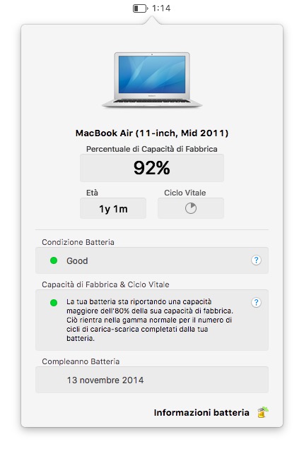 La gestione del programma del ciclo di manutenzione è ottima, facile da capire e l’app guida passo-passo nei vari step necessari a fare tutto. Nella schermata di info della batteria c’è un utile (e rinfrancante) cruscotto analitico che riassume tutte le informazioni del nostro computer: percentuale delle capacità di fabbrica, età (un anno e un mese), torta con il ciclo vitale della batteria (siamo prima delle ore due, buono) e poi l’indicazione della condizione batteria (Good, verde, lo stato migliore rispetto ai cinque possibili: Good, Fair, Poor, Check Battery e Permanent Failure) con infine anche il compleanno della batteria (13 novembre 2014) che non è la data di installazione dell’accumulatore di energia ma della sua produzione.