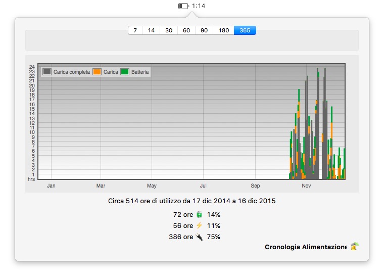 I grafici sono molto chiari, si sono popolati come immaginabile con il passare del tempo e hanno offerto lo spunto per capire meglio il pattern di uso del computer dal punto di vista dell’alimentazione, cercando di influire e modificare il modo con il quale si pianifica la strategia di ricarica.
