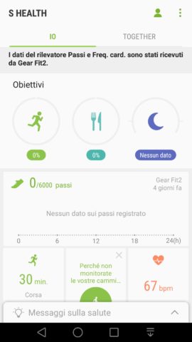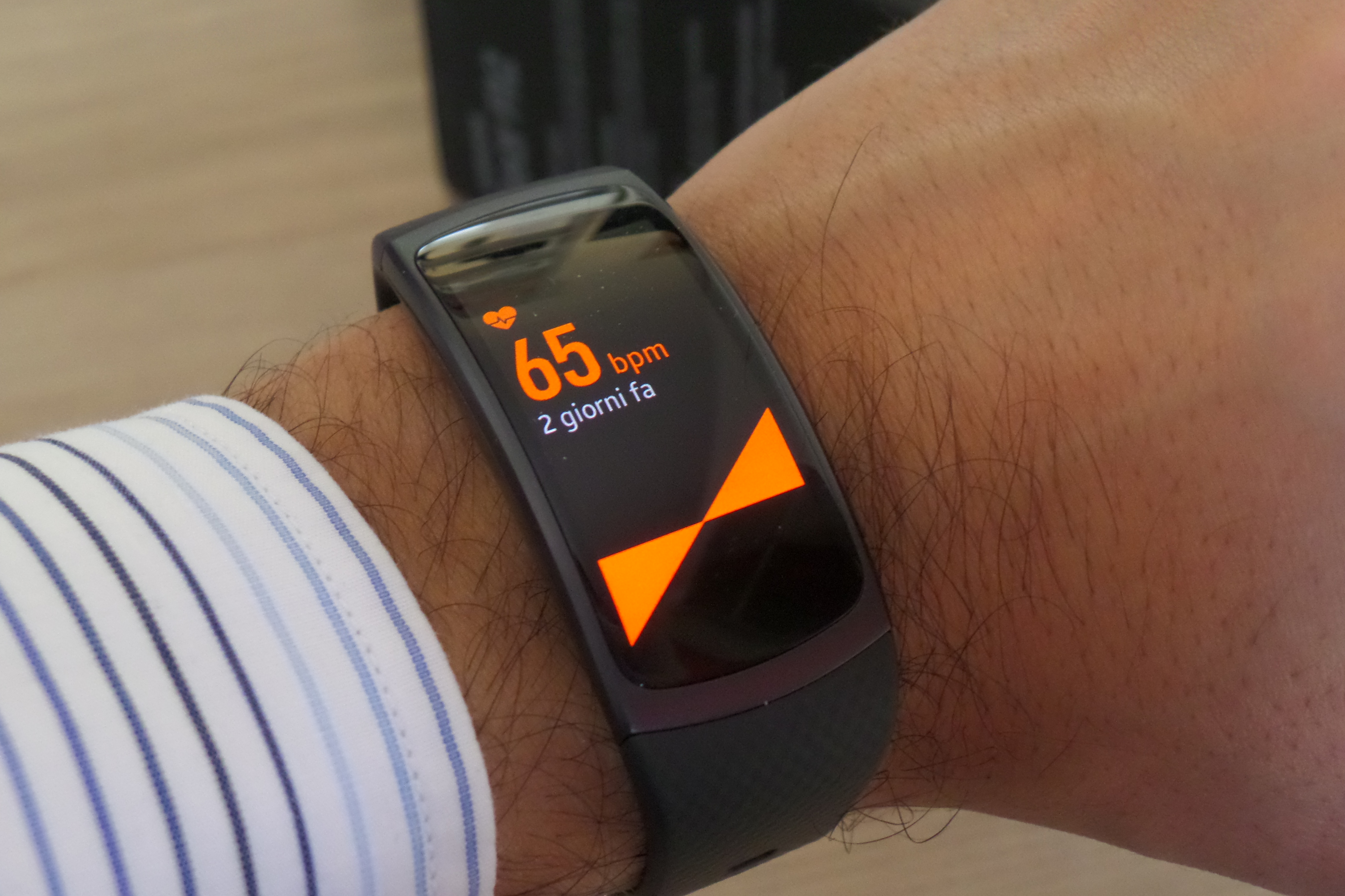 Lo schermo è tattile, ma Gear Fit 2 dispone anche di tue tasti laterali, grazie ai quali sarà possibile tornare indietro, o alla home, oltre a gestire le schermate dedicate all’attività fitness. Il sistema operativo richiede qualche piccolo allenamento per l’utente, che dopo poche ore risulterà però semplice ed intuitivo. Basta girare il polso per risvegliare lo schermo, gesture che funziona praticamente 10 volte su dieci, mentre con semplici slide verso sinistra sarà possibile visionare i menù più importanti della UI, come quelli relativi al conteggio passi, calorie bruciate, ai piani percorsi, agli allenamenti e al battito cardiaco. Già, perché naturalmente Gear Fit 2 dispone di un sensore che monitora il battito ad ogni richiesta, in alcuni casi automaticamente durante la giornata, o in tempo reale durante un allenamento.