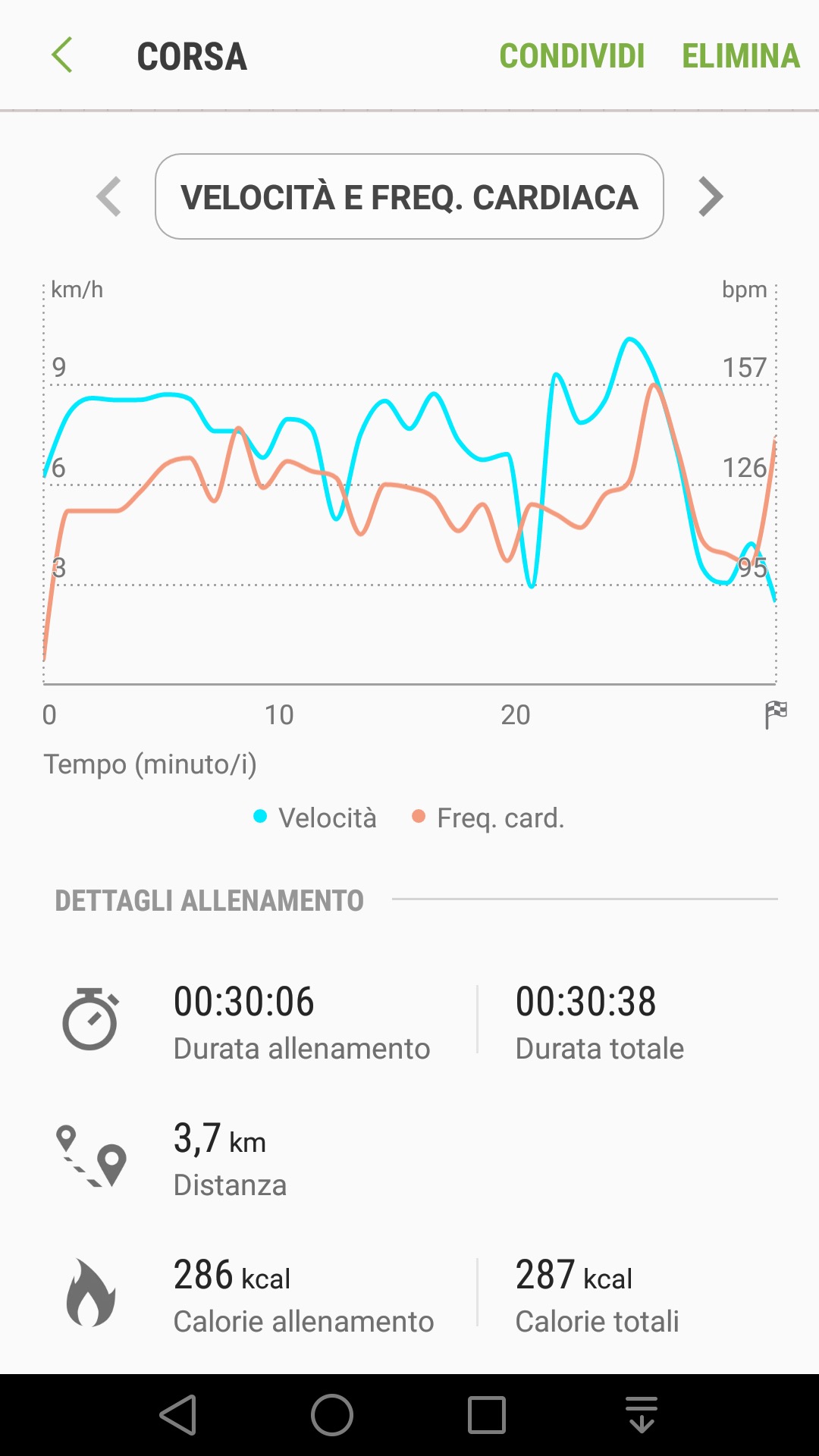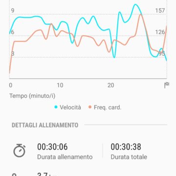Venendo al funzionamento, durante le nostre prove abbiamo sempre riscontrato massima precisione nei dati restituiti dal bracciale. Anzitutto, sono bastati pochi secondi a Gear Fit 2 per ottenere la posizione, così che sin dall’inizio ha potuto tracciare anche a livello geografico il percorso seguito. Il bracciale mostra a schermo, su sfondo nero, tutti i dati relativi alla corsa, con caratteri verdi, massimamente visibili, ben posizionati e sempre leggibili. A schermo appare anzitutto un timer, con il battito cardiaco sempre in bella vista. Sono sufficienti poi pochi slide per ottenere altre informazioni, come la distanza, le calorie bruciate, il ritmo mantenuto e la velocità. Insomma, a portata di mano, anzi di polso, sono sempre visibili tutte le info sulla corsa. Una piccola chicca, poi, è data dalla pausa automatica: quando ci si ferma il bracciale metterà in pausa automaticamente la sessione, per riprenderla non appena si inizia nuovamente a correre.