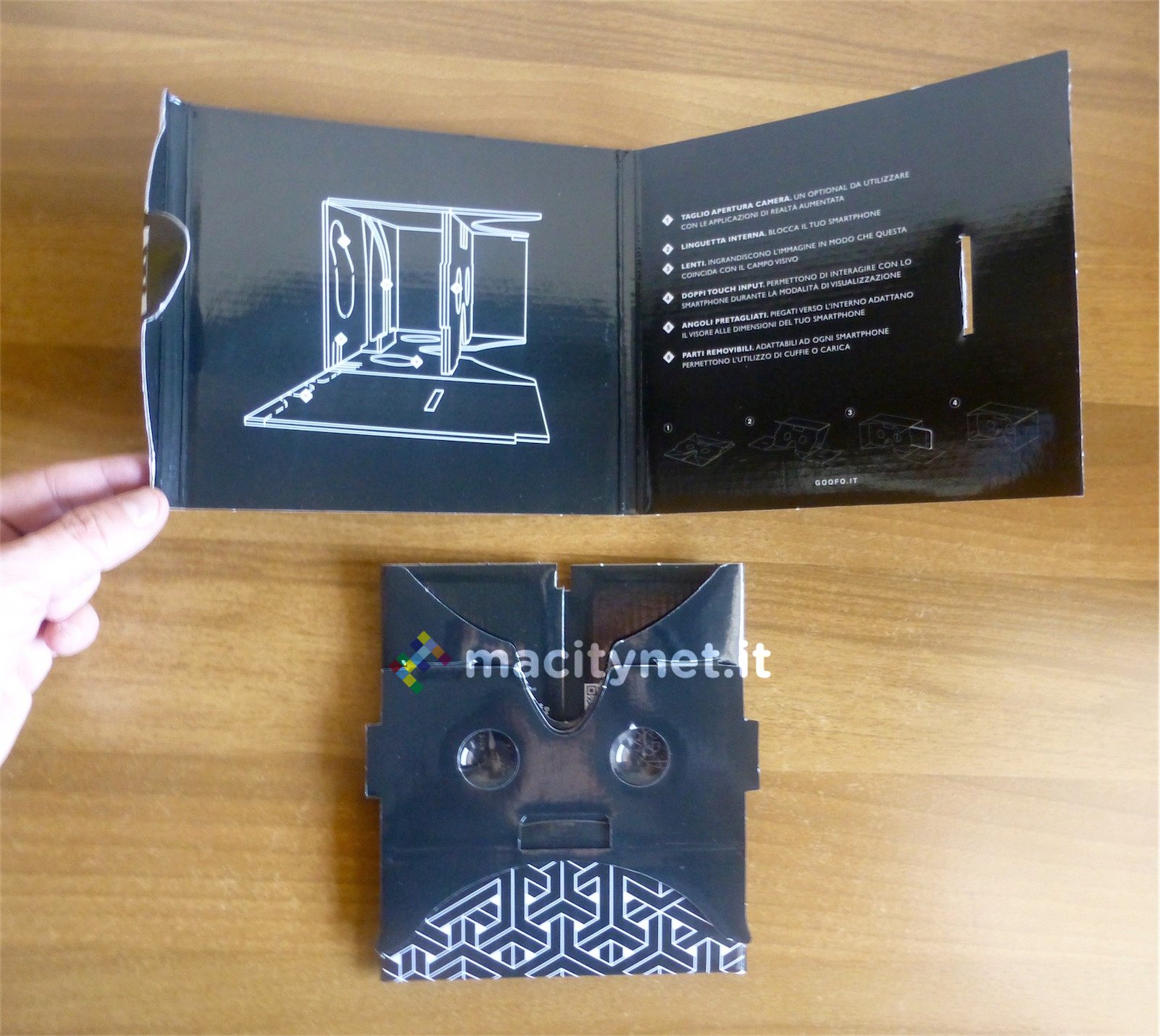 Quando Goofo viene consegnato in una busta piatta, basta estrarlo e dispiegarlo su sé stesso, una procedura a portata di bambino che ricorda molto da vicino i libri pop-up, con costruzioni 3D in cartone che prendono forma quando si girano le pagine dei libri per ragazzini. Si fa leva su un paio di punti, si inseriscono due linguette in una fessura e il nostro visore Goofo è pronto per funzionare.