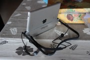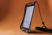 Come si evince dalle immagini che alleghiamo nella pagina seguente, il GoPad è composto da un unico pezzo in alluminio il cui funzionamento, a prima vista, può non risultare proprio chiaro. Lo si comprende infatti soltanto quando si fissa il tablet al suo interno per mezzo delle quattro viti esagonali (la chiave è inclusa nella confezione) che lo tengono ben fermo e saldo su un lato, anche se a vederlo da lontano non si direbbe. L’unica parte in plastica sta nei due piccoli morsetti che tengono fermo il tablet, la cui stabilità è aiutata dal sottile strato in gomma presente sugli stessi e sulla staffa che si va a posizionare sul retro dell’iPad. Un più spesso strato in gomma lo troviamo sulla curvatura del “manico”, che andrà appoggiata al corpo durante l’utilizzo che, grazie alla corta elastica fatta passare dietro al collo, può essere eseguito tranquillamente in piedi mentre si passeggia.