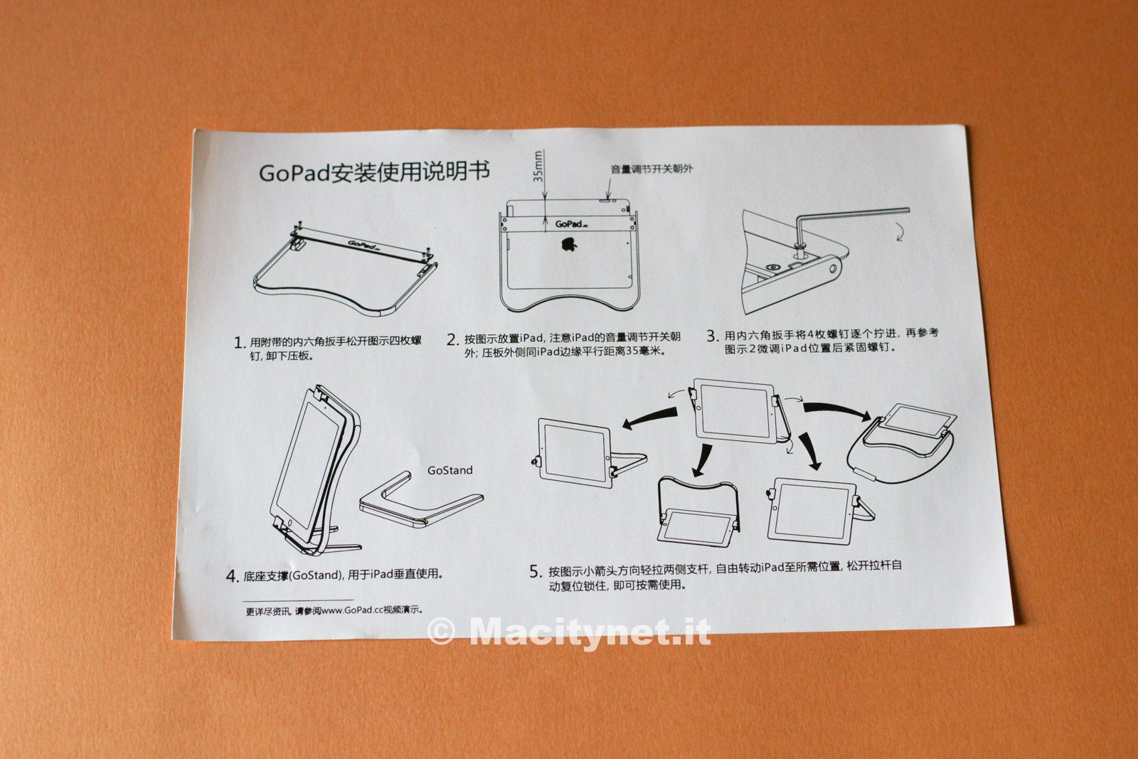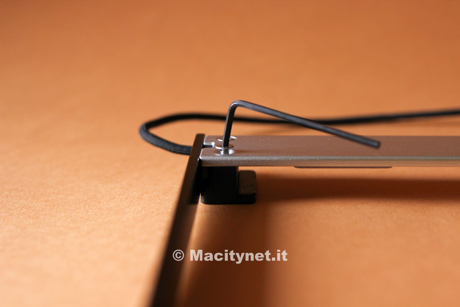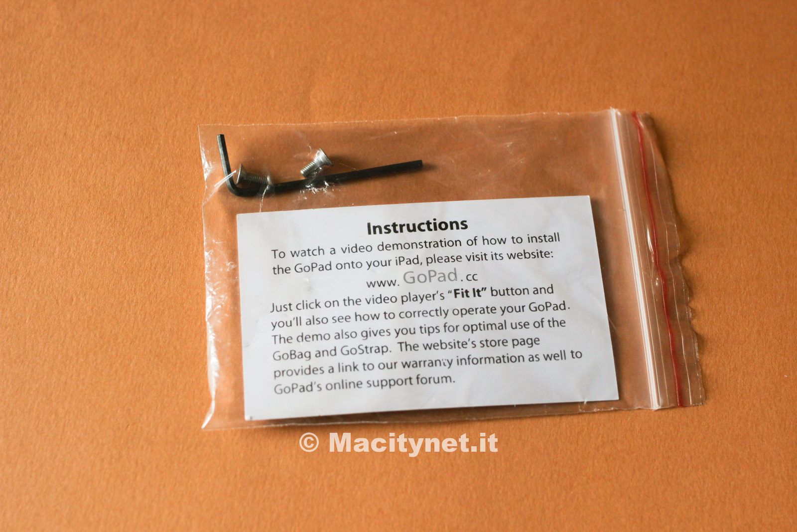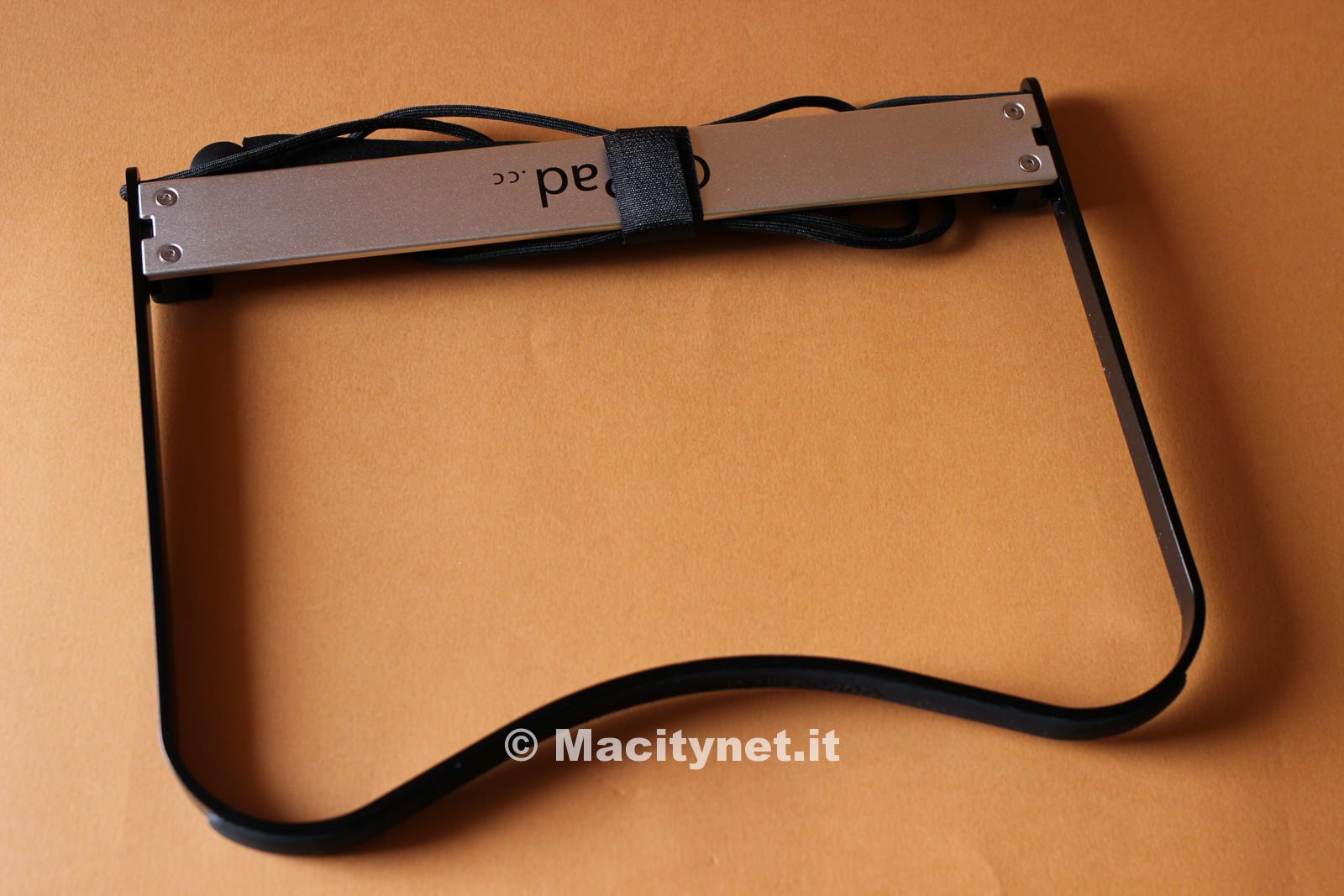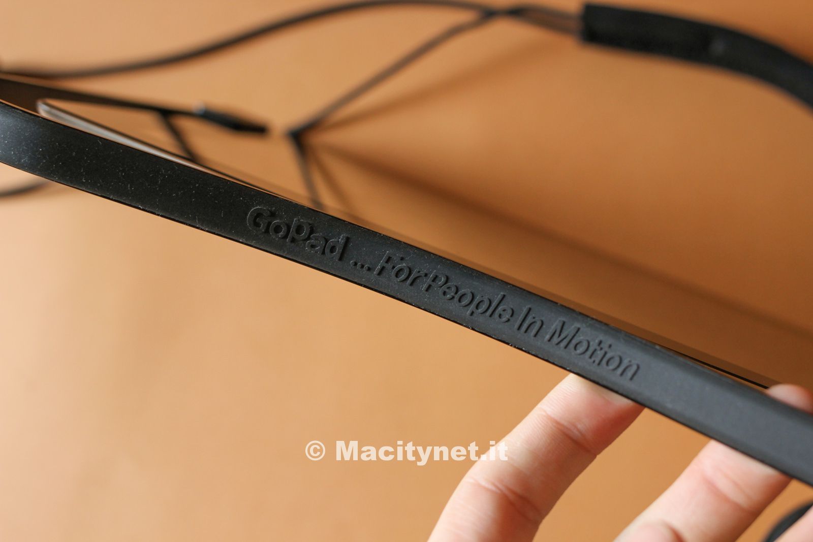 Come si evince dalle immagini che alleghiamo nella pagina seguente, il GoPad è composto da un unico pezzo in alluminio il cui funzionamento, a prima vista, può non risultare proprio chiaro. Lo si comprende infatti soltanto quando si fissa il tablet al suo interno per mezzo delle quattro viti esagonali (la chiave è inclusa nella confezione) che lo tengono ben fermo e saldo su un lato, anche se a vederlo da lontano non si direbbe. L’unica parte in plastica sta nei due piccoli morsetti che tengono fermo il tablet, la cui stabilità è aiutata dal sottile strato in gomma presente sugli stessi e sulla staffa che si va a posizionare sul retro dell’iPad. Un più spesso strato in gomma lo troviamo sulla curvatura del “manico”, che andrà appoggiata al corpo durante l’utilizzo che, grazie alla corta elastica fatta passare dietro al collo, può essere eseguito tranquillamente in piedi mentre si passeggia.