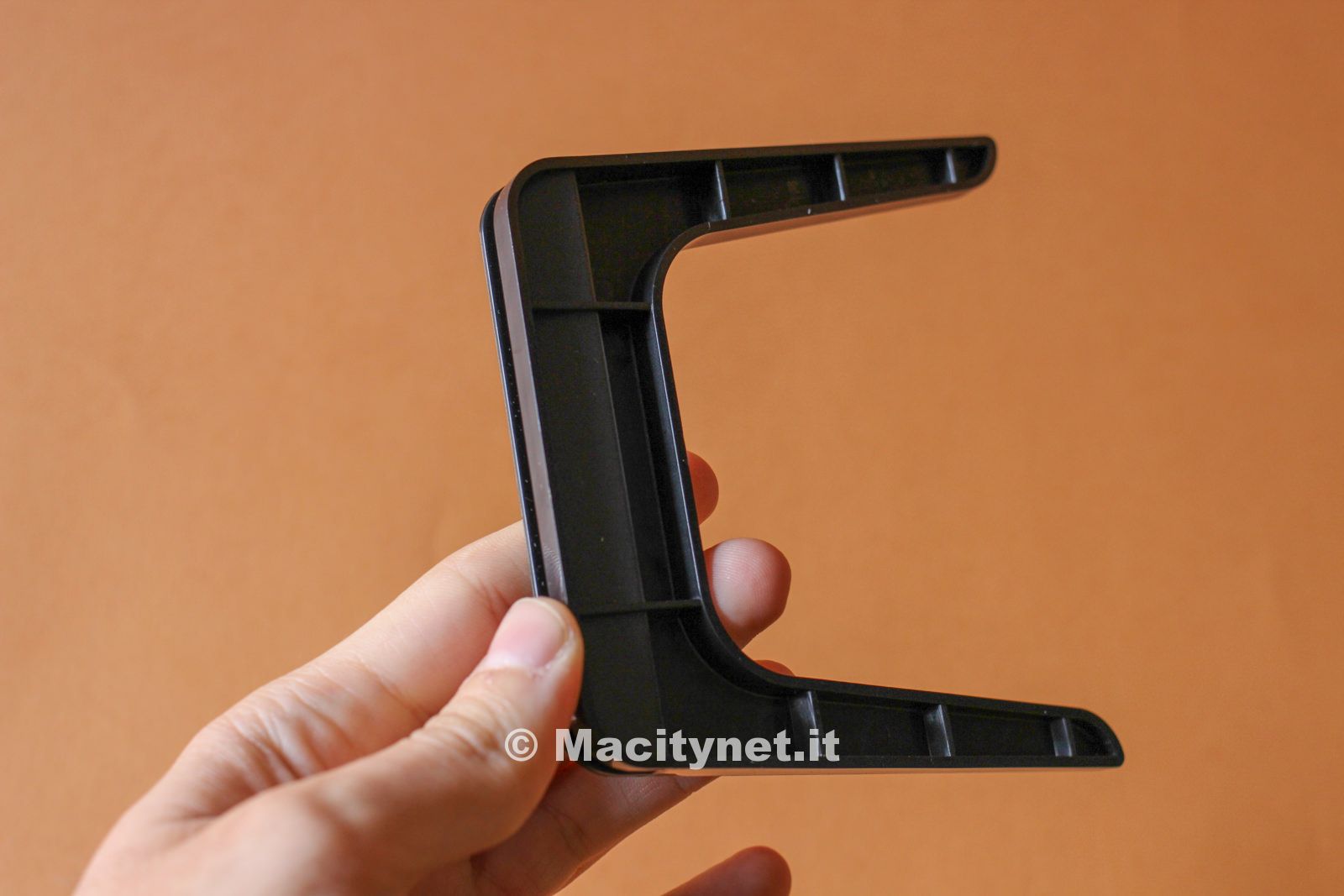 Comodo tanto per dare uno sguardo alla mappa quanto per navigare in internet, rispondere ad una mail oppure scrivere un lungo testo. Il sistema risulta stabile sia da fermi, sia mentre si cammina, ed aiuta a tenere il tablet alla giusta distanza ed inclinazione anche se ci si siede più comodamente su un divano. I morsetti in plastica possono essere ruotati di 360 gradi così da sfruttare la staffa che solitamente va ad appoggiarsi sul corpo, come cavalletto per l’utilizzo su una superficie piana. Se invece si vuole mantenere il tablet in verticale, incluso nella confezione c’è un piccolo accessorio in plastica che si aggancia ad uno dei due lati del manico in alluminio fungendo da pratico stand.