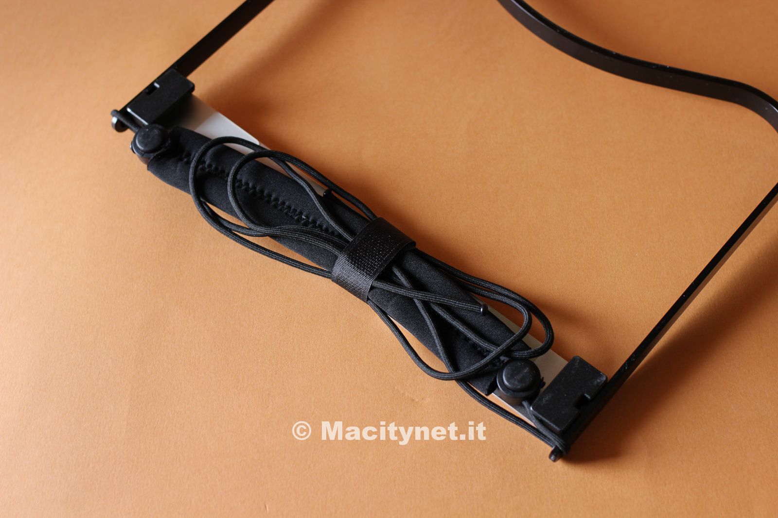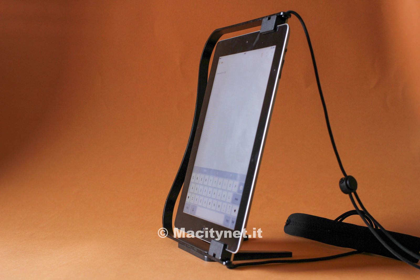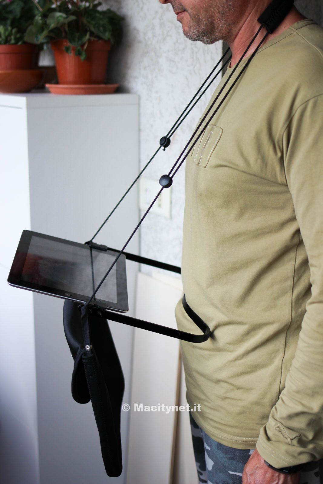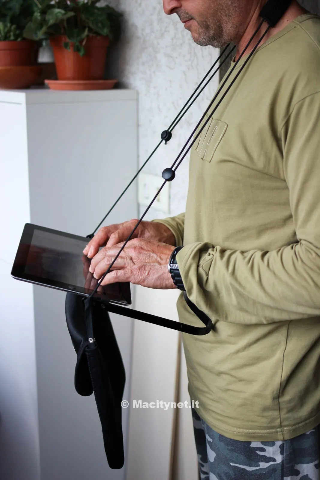 La cinghia che va posizionata dietro al collo durante l’utilizzo è regolabile per mezzo di due fermi in plastica a pulsante e, grazie alla borsa in morbida stoffa sintetica è possibile sfruttare il sistema anche per il trasporto a spalla, assicurando la borsa al tablet attraverso due ganci a bottone.