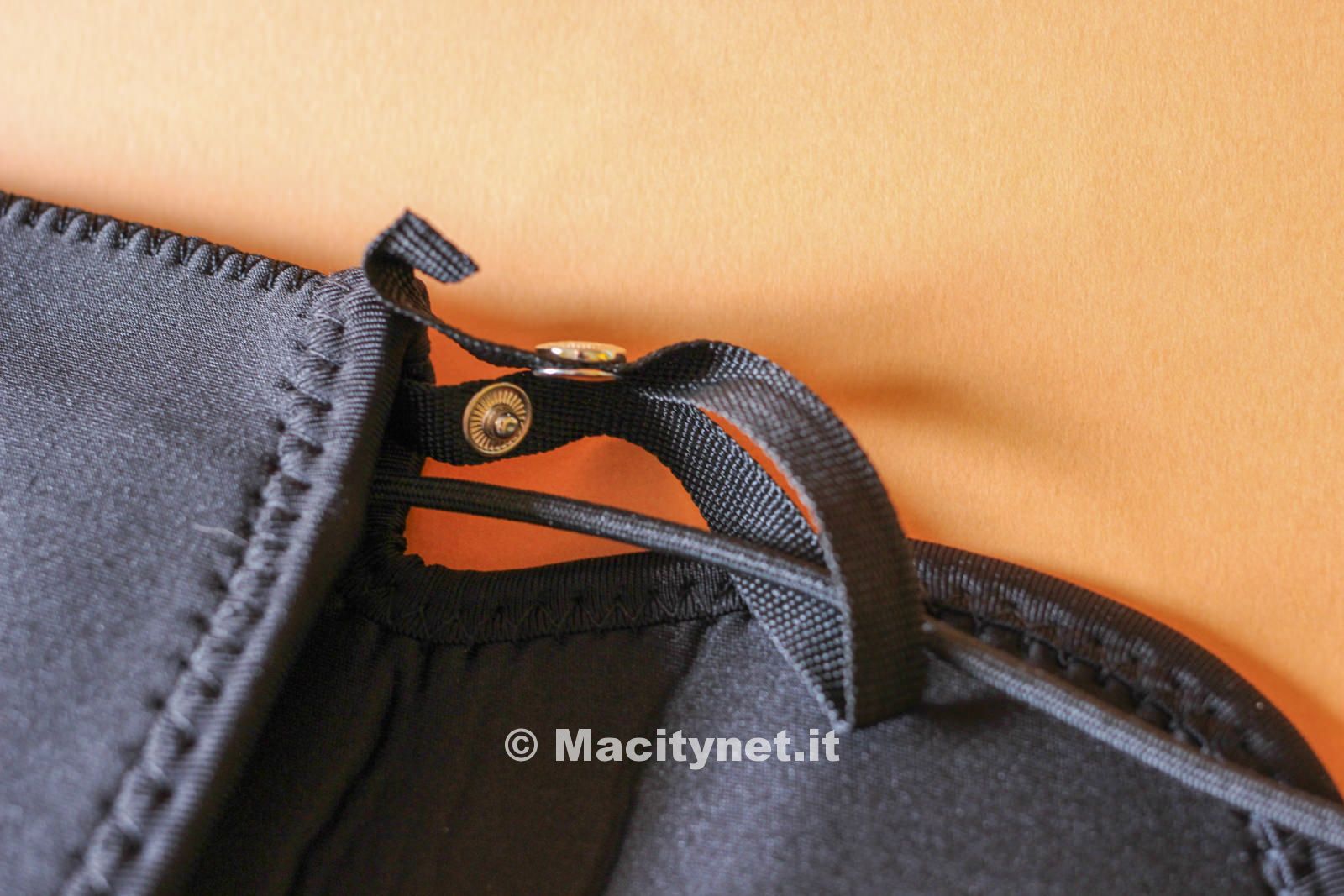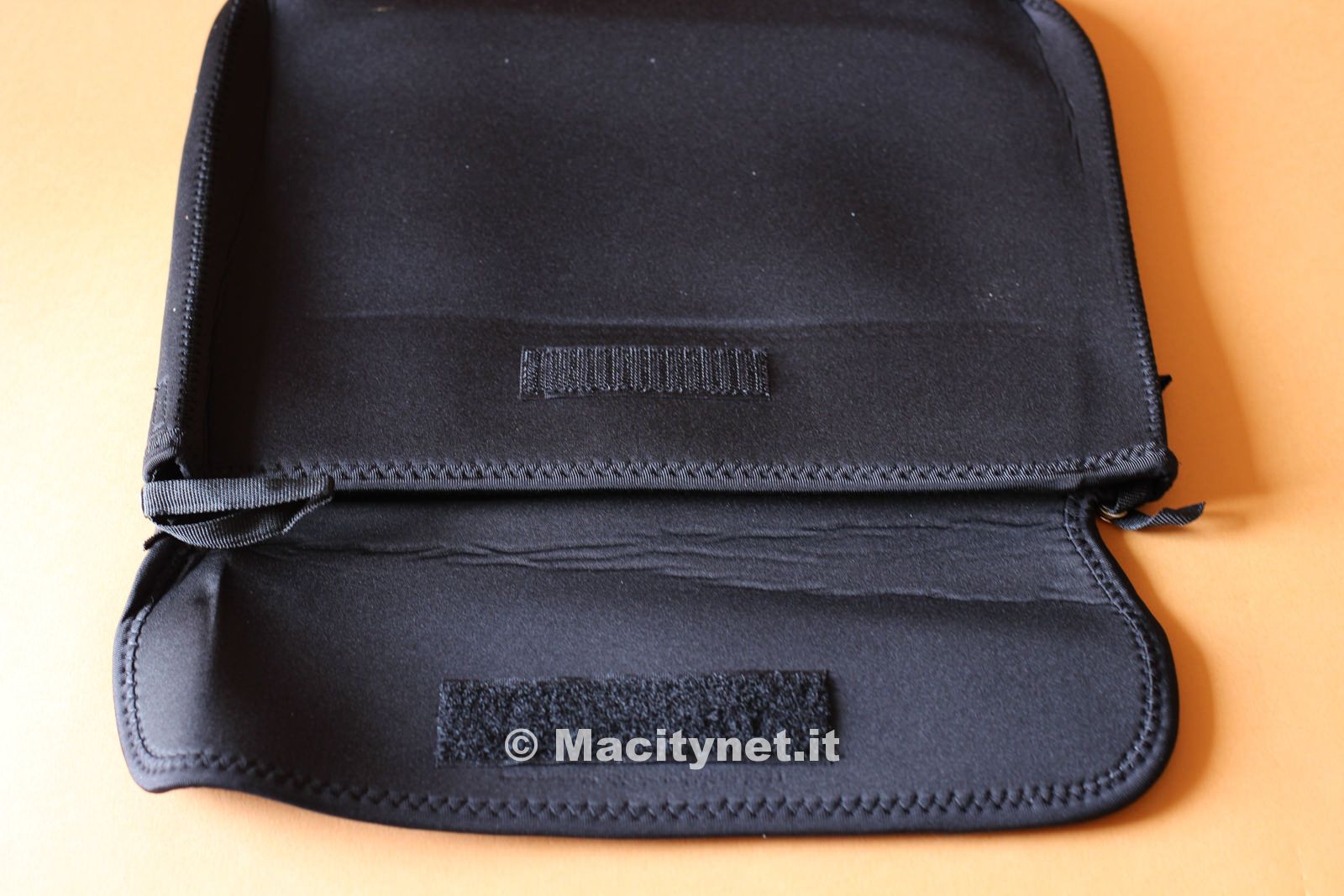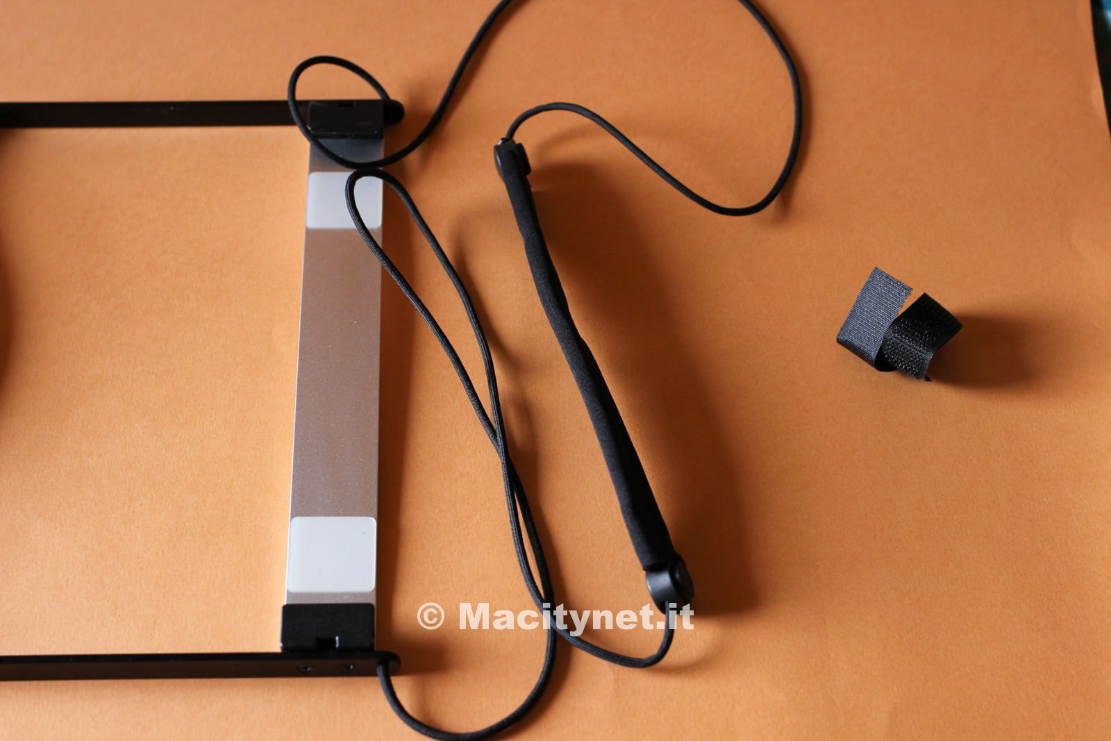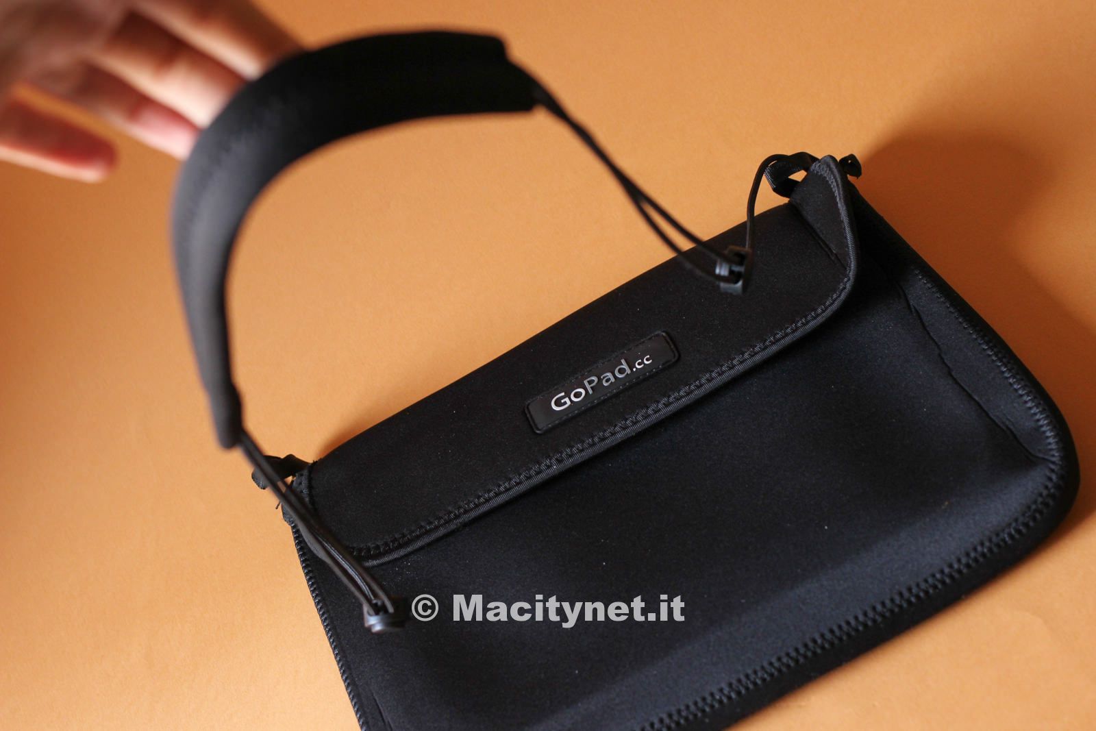La cinghia che va posizionata dietro al collo durante l’utilizzo è regolabile per mezzo di due fermi in plastica a pulsante e, grazie alla borsa in morbida stoffa sintetica è possibile sfruttare il sistema anche per il trasporto a spalla, assicurando la borsa al tablet attraverso due ganci a bottone.