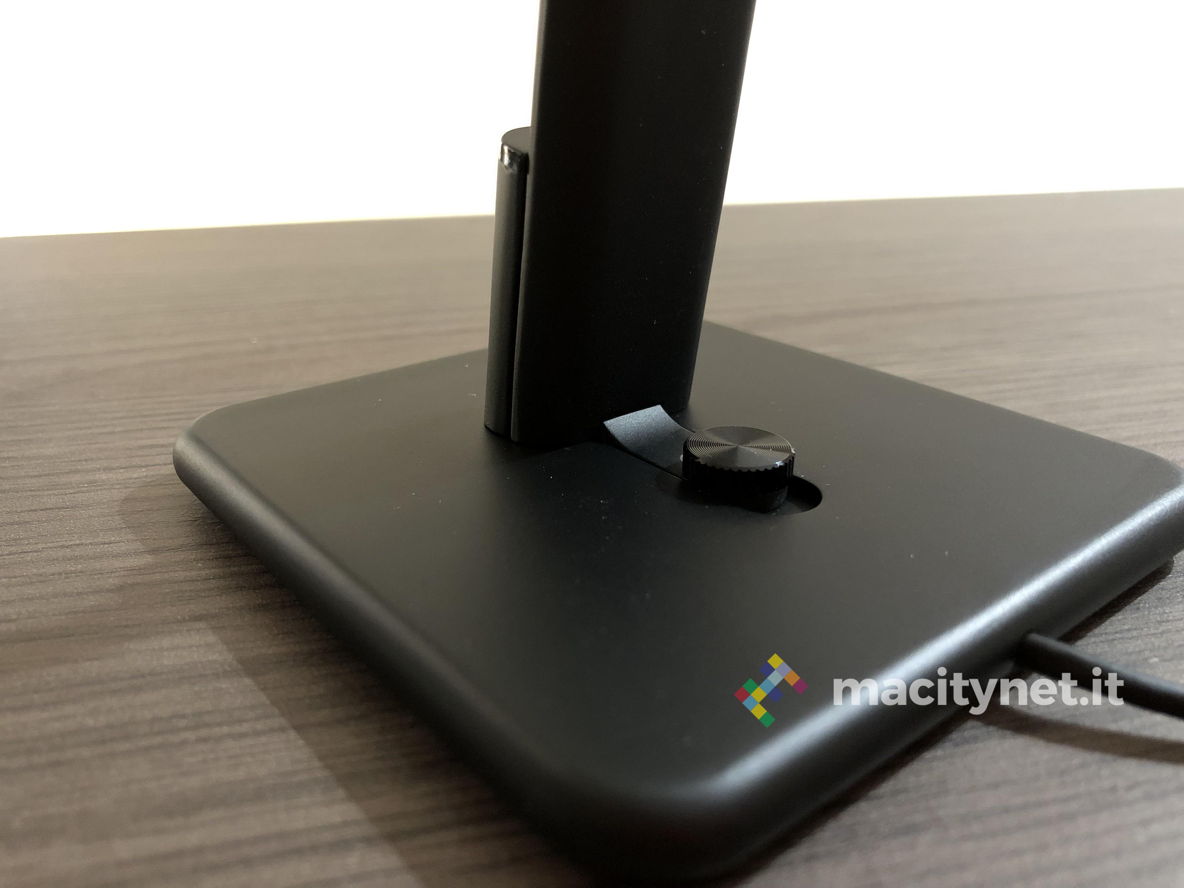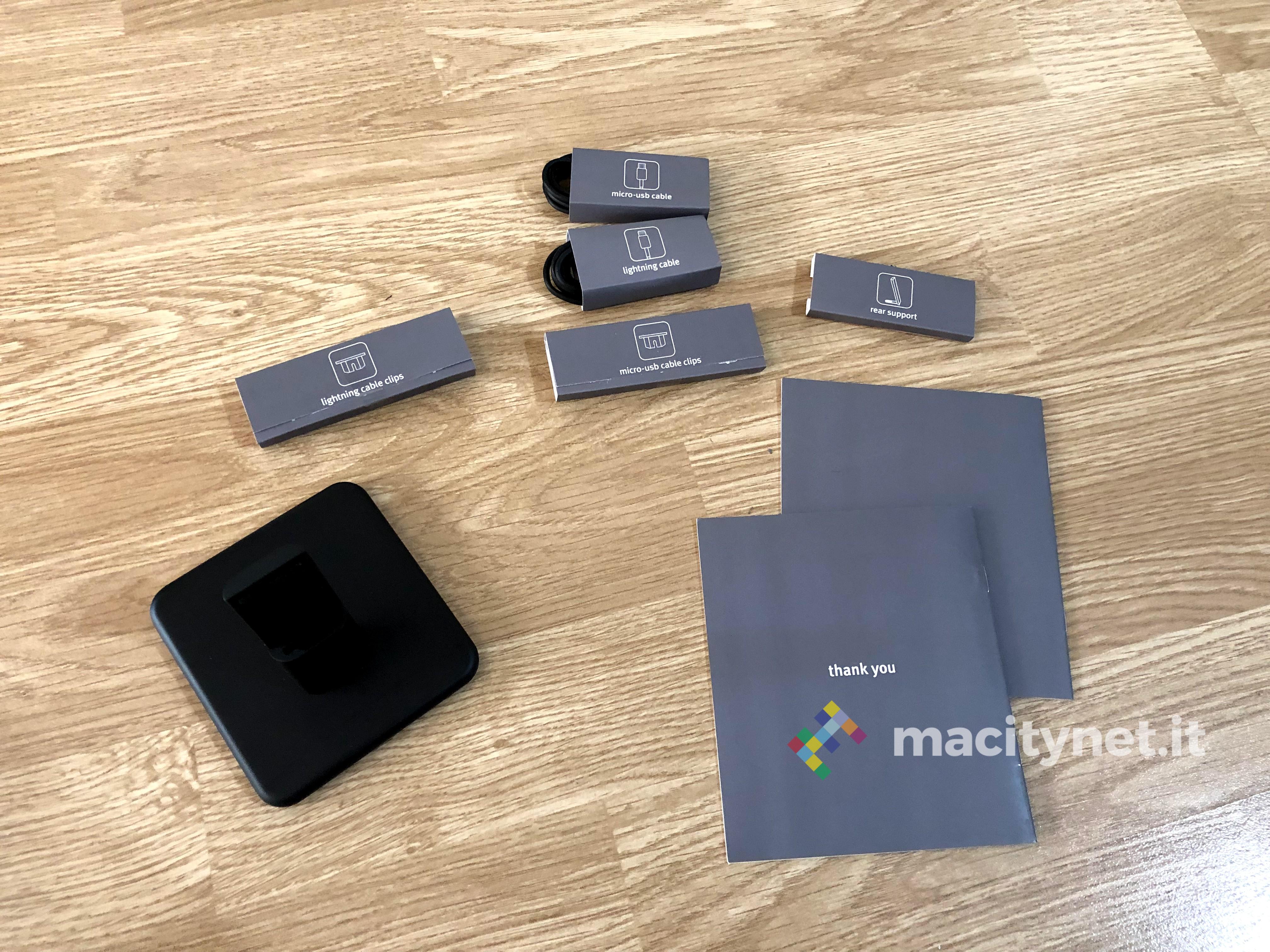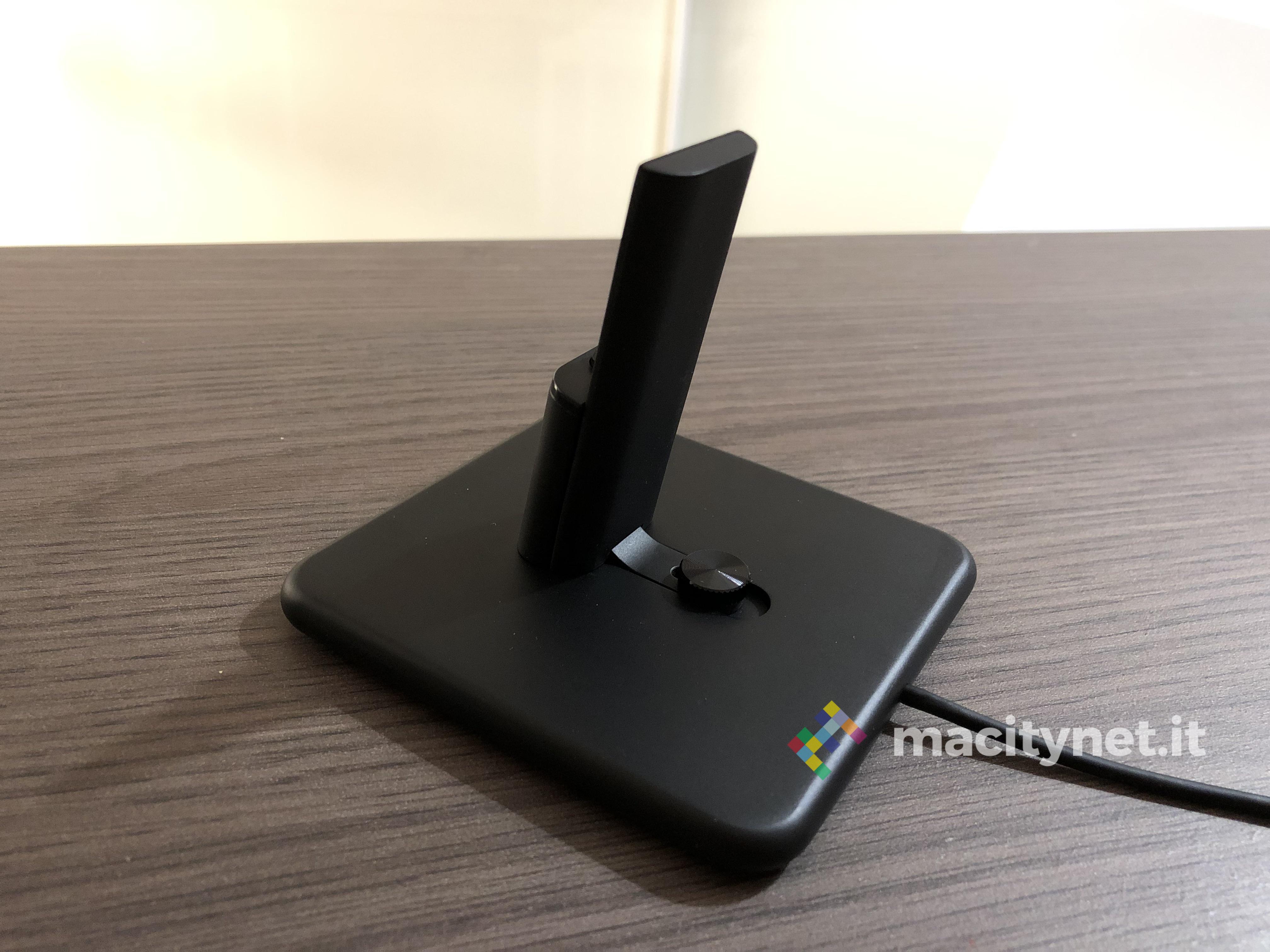 Alla base del supporto è presente un coperchio, da rimuovere per inserire il cavo, Lightning o MicroUSB che sia, e all’interno del quale può essere nascosto il filo di ricarica.