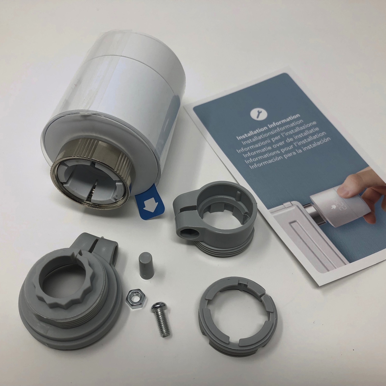 Qui sotto vediamo la confezione della valvola completa degli adattatori: verificate prima dell’acquisto se la valvola termostatica o la semplice manopola manuale che andate a sostituire è tra quelle elencate da tado° negli adattatori che mette a disposizione nella confezione.