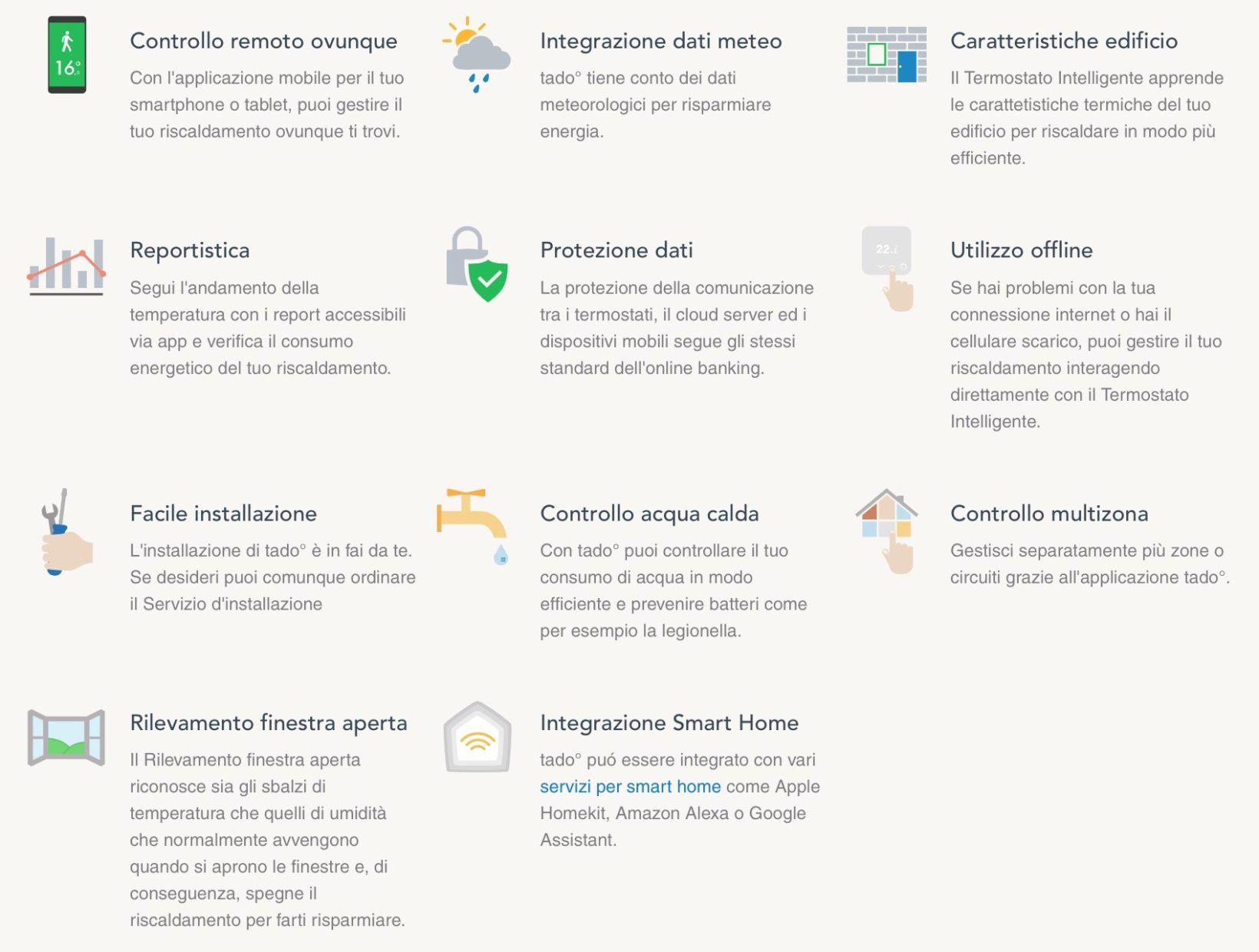L’immagine qui sotto rappresenta tutte le caratteristiche di gestione del termostato tado°.