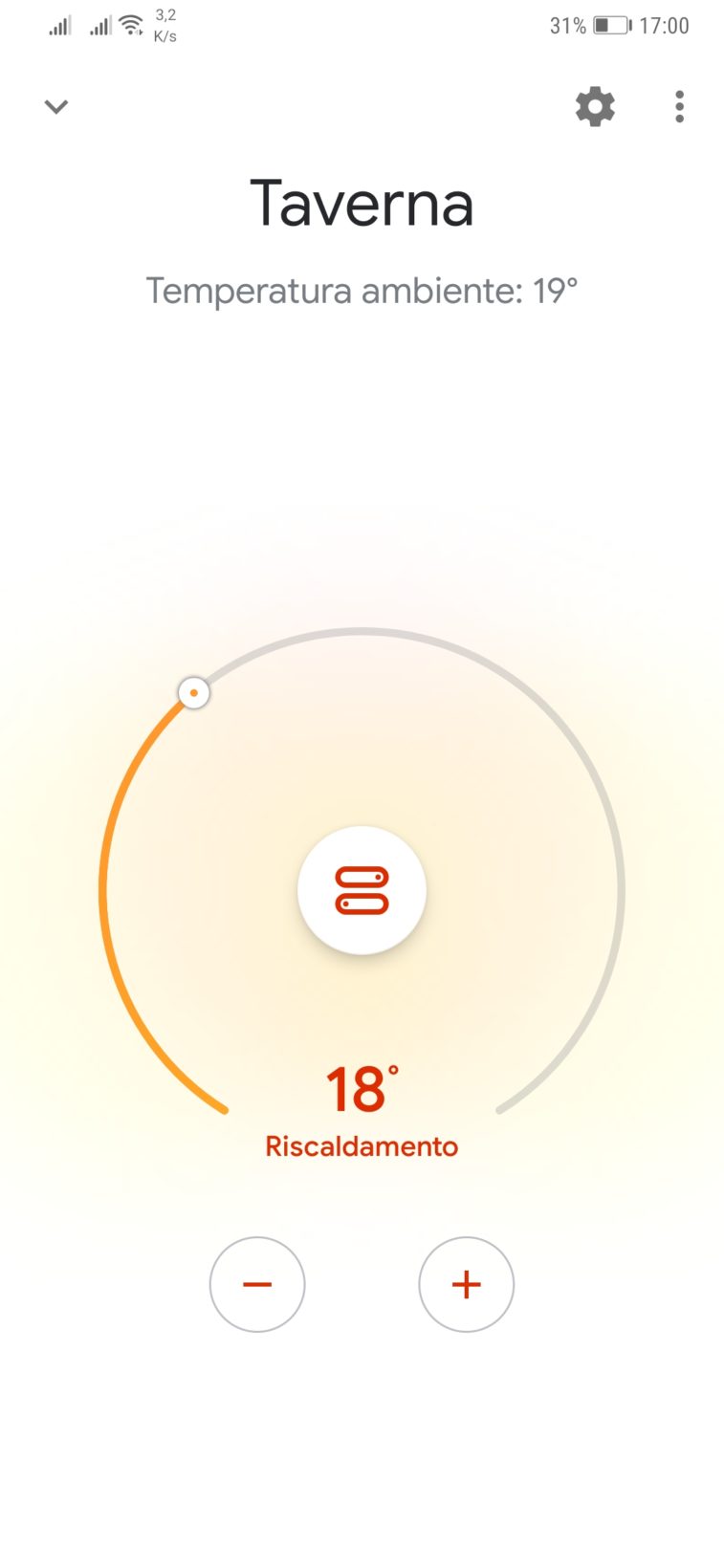 Il box che otteniamo porterà il nome del termostato (liberamente definibile) con un cerchio che mostra la temperatura corrente e in basso una scritta “Aumento a xx°” che rappresenta la temperatura attesa: quella a cui abbiamo impostato il termostato manualmente o attraverso la programmazione. Il termine “Aumento” è un po’ inappropriato ed e’ forse figlio delle primissime versioni del software perché a volte la temperatura che si desidera è più bassa delle corrente: sarebbe più corretto scrivere “imposto” così da avere una definizione più generica ed adattabile. Se clicchiamo sul bottone abbiamo un potenziometro a schermo sul nostro iPhone che ci permetterà di regolare la temperatura per gradi o spegnere e accendere il sistema di riscaldamento.
