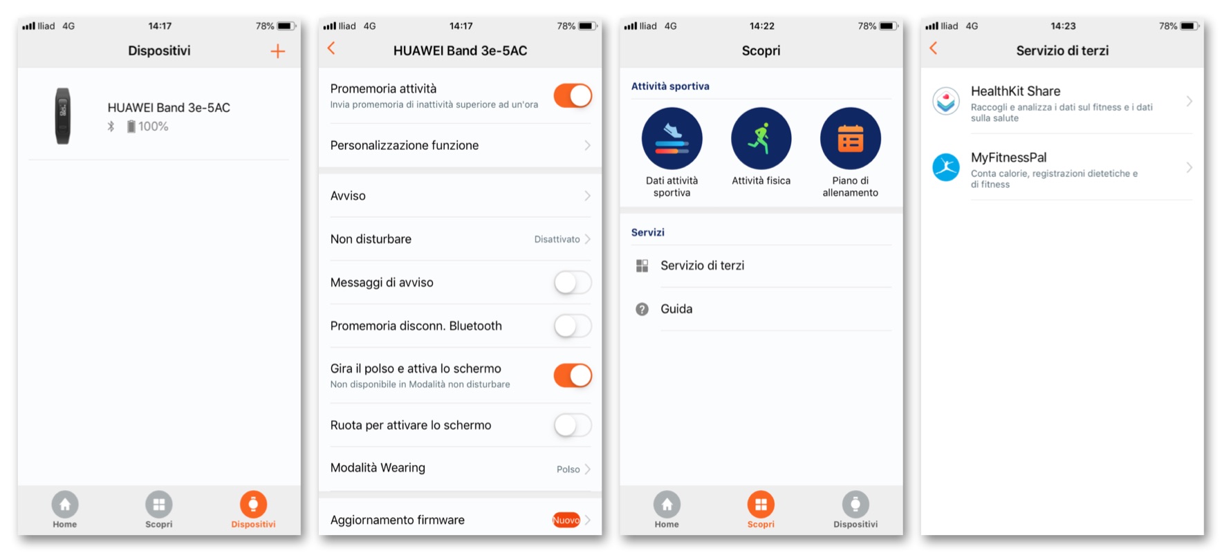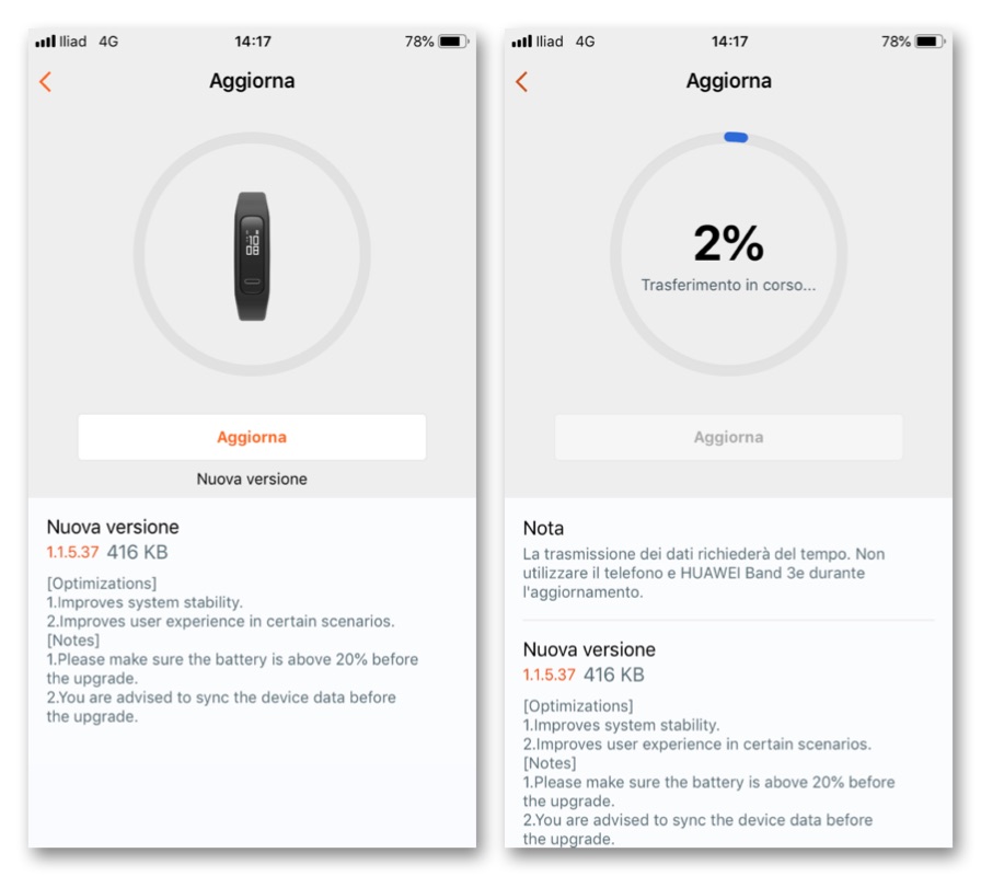 Questa fase, sebbene sia rapida, risulta poco chiara: giunti al punto in cui bracciale e smartphone si cercano per agganciarsi tra loro, il sistema ci restituiva costantemente un messaggio di errore dicendoci che non era stato trovato nessun Huawei Band 3e. Eppure, ogni volta che ripetevamo il processo, il nostro iPhone elencava subito il dispositivo come visibile ed attivo nelle vicinanze. Sostanzialmente, nel momento in cui il bracciale vibra perché “connesso” al telefono, è necessario sfiorare il pulsante touch incassato sotto al display per dare l’ok e proseguire con il processo di abbinamento.