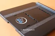 L’inclinazione è resa possibile da uno stand a V che si apre e può essere piegato all’occorrenza in 12 posizioni diverse: in questo modo sarà possibile inclinare il tablet nella posizione più comoda ed utile allo scopo, sia con una leggera inclinazione se lo si appoggia sulle gambe durante magari la digitazione di un testo, sia aumentandola per la visione di un filmato appoggiando il tavolino sul lato del letto, sia portandola al massimo (con il dispositivo inclinato quasi in posizione verticale) per guardare un film mentre si è magari completamente distesi. A rendere ancora più confortevole l’utilizzo dell’accessorio troviamo un cuscino agganciato sulla base: in questo modo potremo appoggiarlo sopra le gambe ammortizzando su tutta la superficie di appoggio ed al contempo stabilizzandosi maggiormente in quanto prende per l’appunto la forma del nostro corpo.