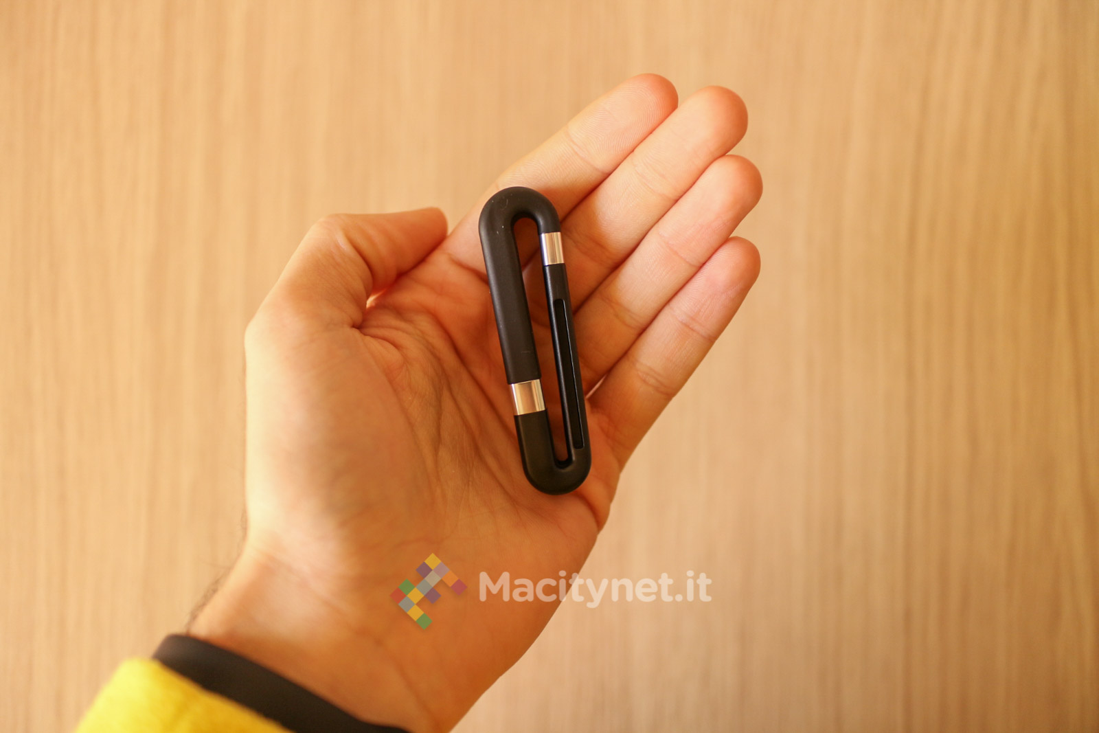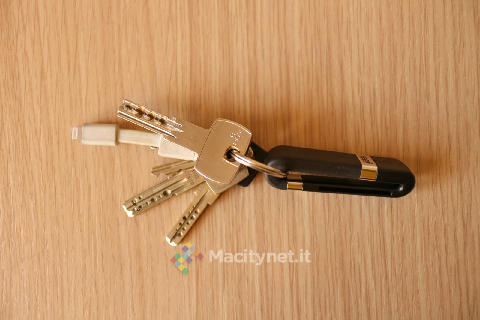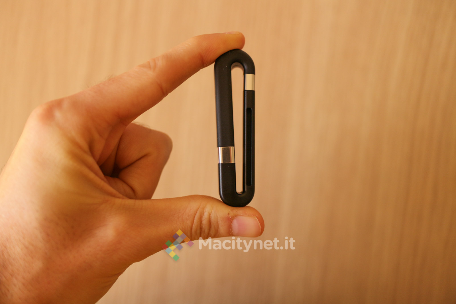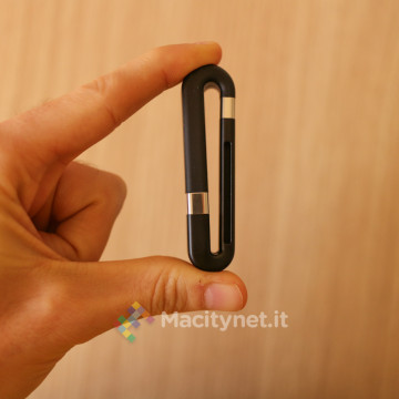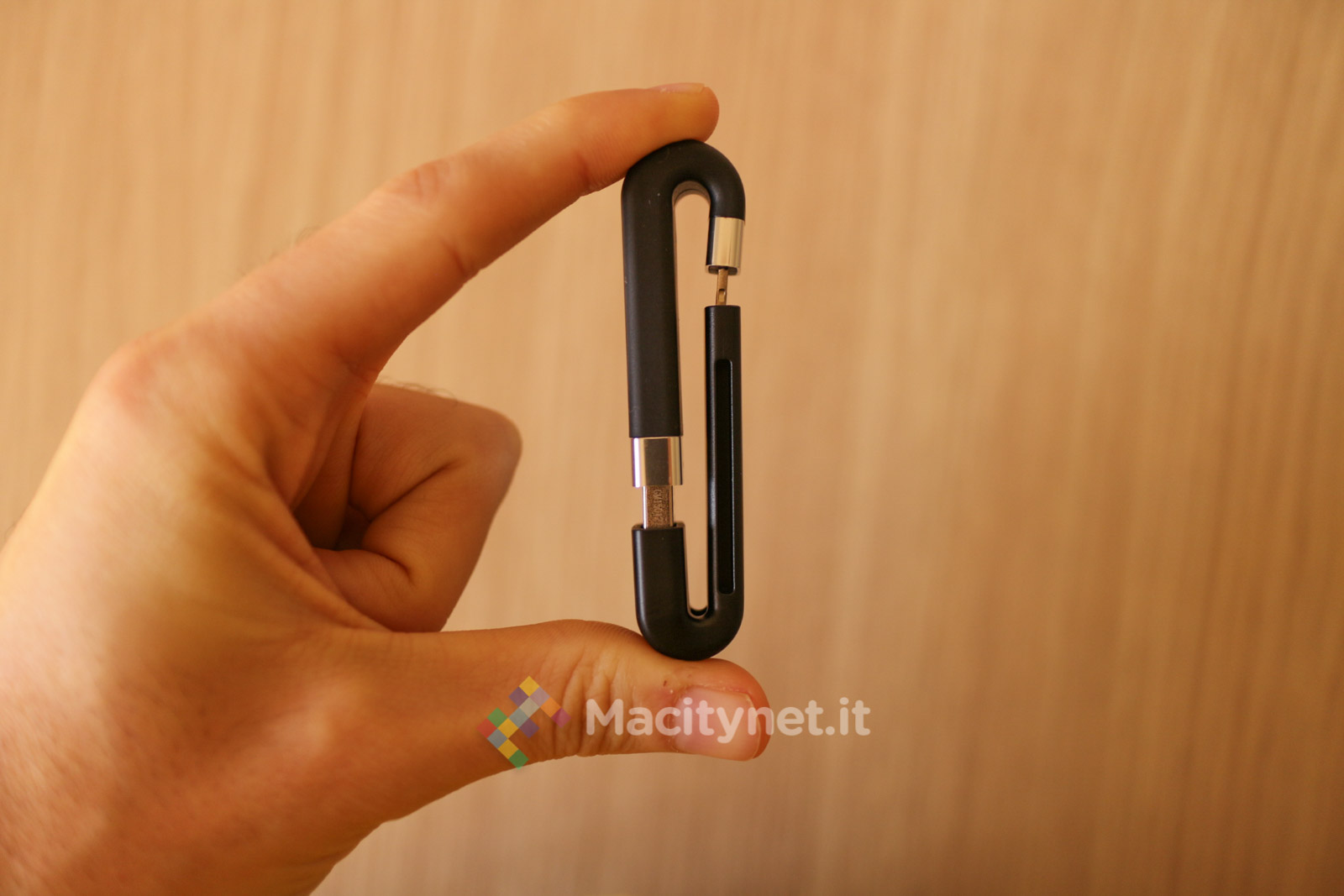 Il cappuccio, come si nota dalle immagini, si chiude con la chiavetta formando una sorta di ellisse. Da un lato c’è un foro che facilita l’aggancio della chiavetta – ad esempio – a un mazzo di chiavi, tuttavia visto il particolare sistema con cui si chiudono le due parti, tornando all’esempio del mazzo di chiavi si può anche pensare di “chiudere” la chiavetta intorno all’anello (vedi immagine che segue) e sganciarla all’occorrenza, avendo le due parti sempre libere potendo così scegliere di volta in volta se spostarla ad esempio all’interno di un marsupio o una tasca dei pantaloni senza essere vincolati da altri oggetti.