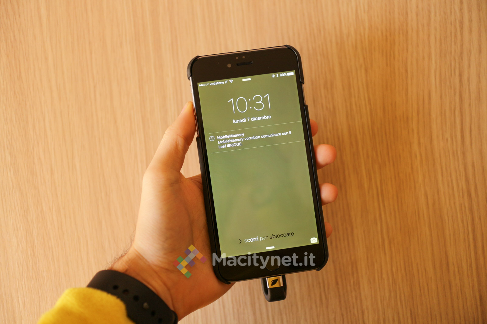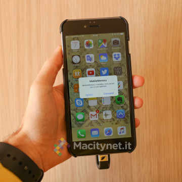 Il funzionamento è abbastanza basilare. Per usarla su iPhone e iPad è necessario scaricare l’app gratuita MobileMemory. Nel momento in cui si inserisce la chiavetta, sia se lo schermo del dispositivo è bloccato, sia se è sbloccato e ci sono aperte altre applicazioni, una notifica informerà dell’avvenuto riconoscimento del dispositivo e faciliterà l’apertura dell’app.