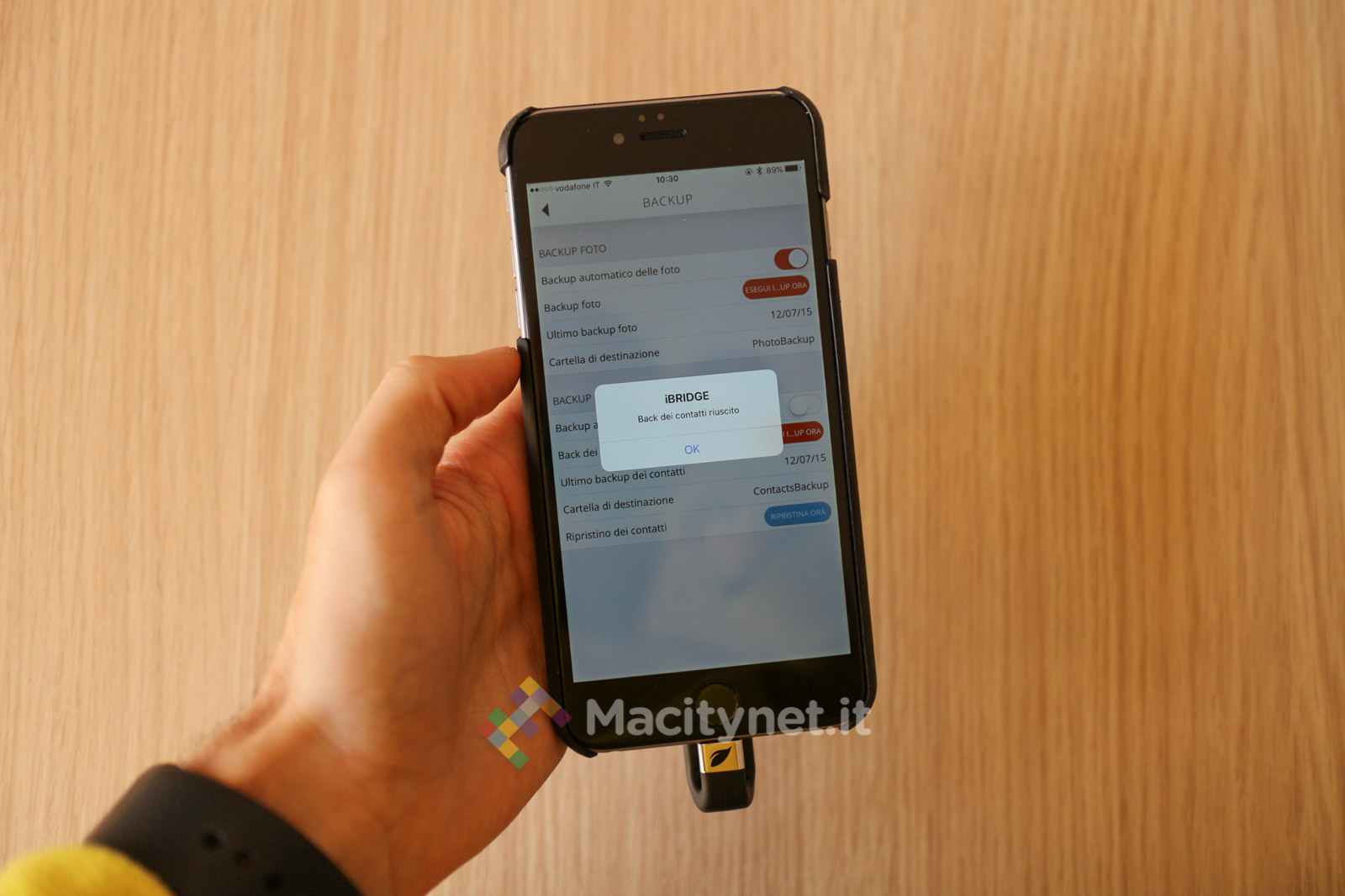 Con FOTOCAMERA iBRIDGE si ha un’app per scattare foto e registrare video salvandoli direttamente sulla chiavetta iBridge piuttosto che all’interno del rullino foto del telefono. Si tratta di una opzione particolarmente utile per chi ha poco spazio su iPhone o vuole rapidamente spostare filmati e video registrati sul computer trasferendoli attraverso il collegamento USB della chiavetta; dall’ultima sezione, IMPOSTAZIONI, si possono infine regolare alcune opzioni come “mostra i files nascosti” e poco altro; più interessante è invece la sottosezione Backup che permette di abilitare l’auto-copia di foto e contatti all’interno di specifiche cartelle create automaticamente nella chiavetta iBridge. E’ anche possibile decidere di non attivare l’auto-backup, creando comunque una copia di foto e contatti cliccando manualmente i relativi pulsanti.