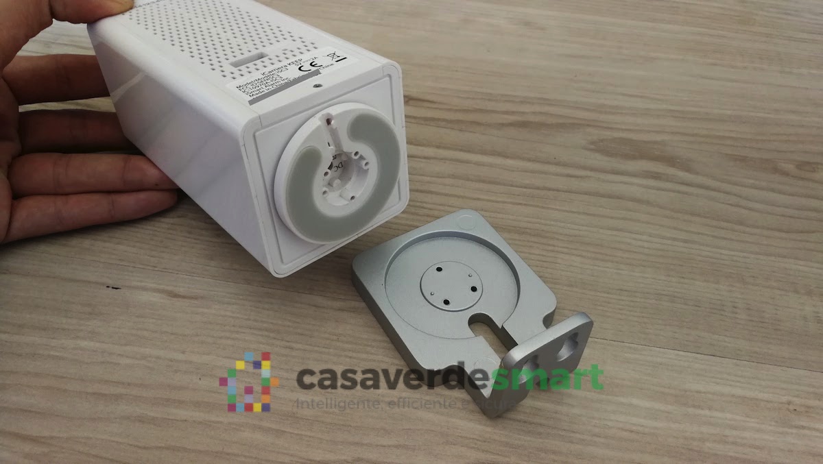Anzitutto il contenuto della confezione. Oltre alla camera in sé, che ha dimensioni comunque vistose, all’interno della confezione ad il supporto il metallo, per meglio posizionarlo su qualsiasi superficie o per inchiodarlo al muro.