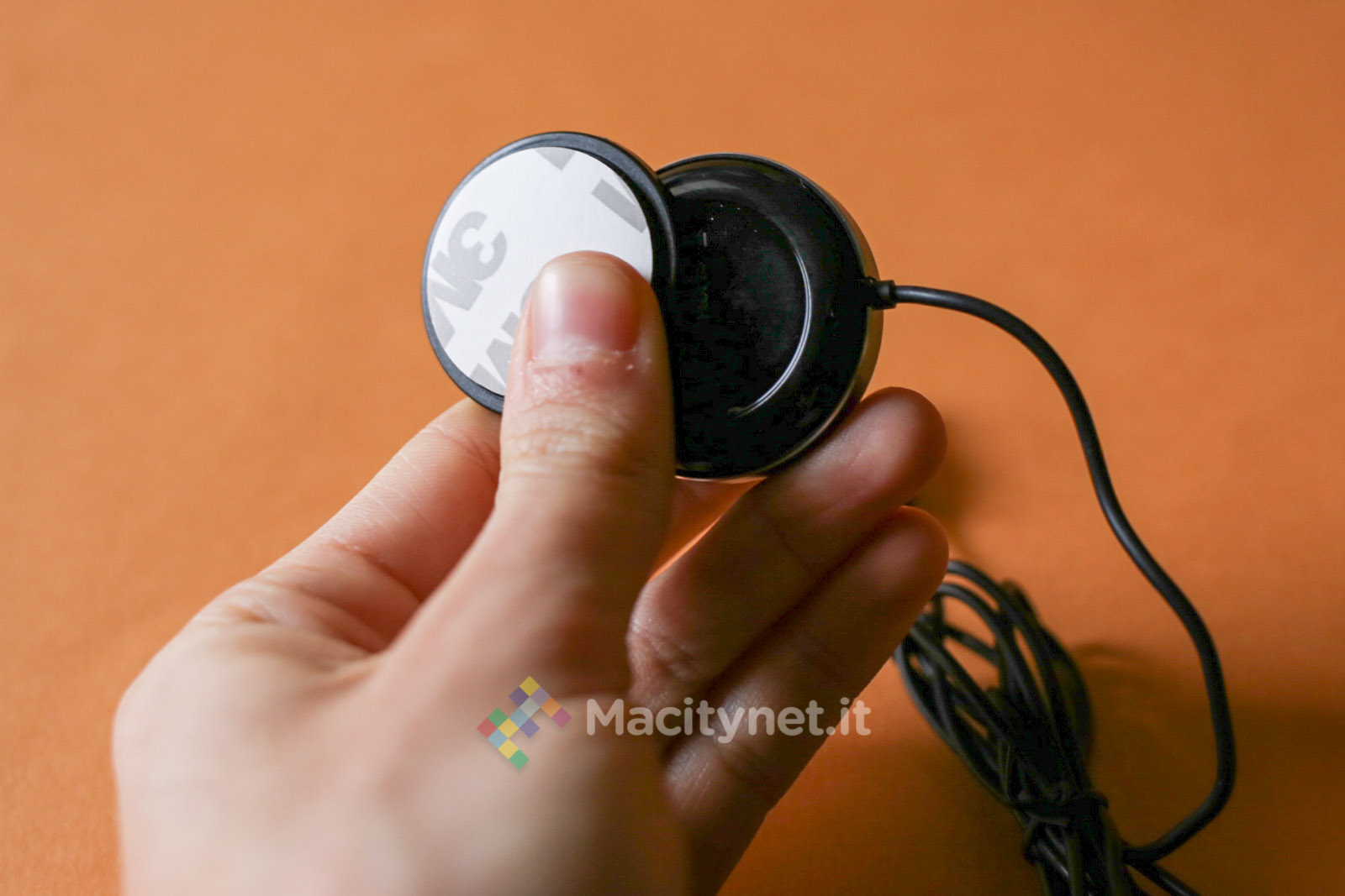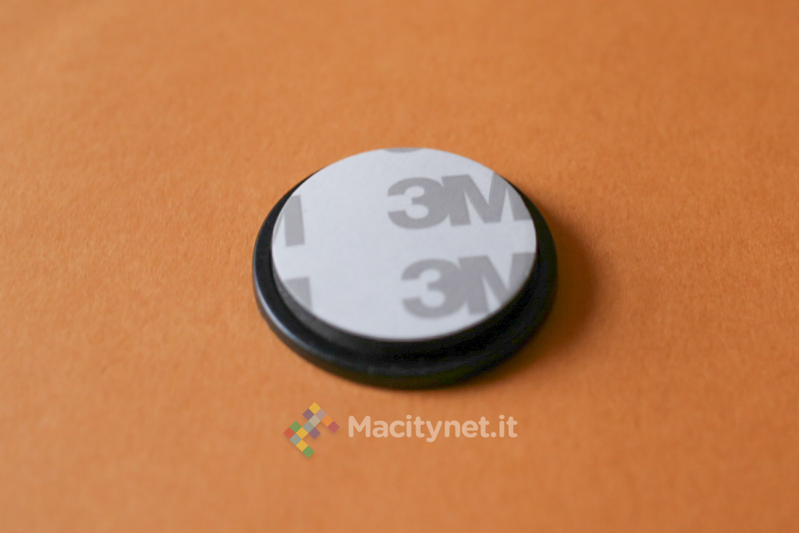 Sul retro è nascosta una calamita che si aggancia alla piastra inclusa nella confezione dotata di adesivo 3M: questa piastra va sostanzialmente agganciata sul cruscotto della macchina avendo cura di posizionarla su di una superficie liscia e abbastanza vicina a noi per poter interagire coi pulsanti all’occorrenza.