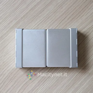 La tastiera viene venduta insieme ad una sacca in velluto per facilitarne il trasporto ed evitare che, lasciandola libera in una borsa, si possa aprire o graffiare. Insieme troviamo anche un manuale delle istruzioni ed un cavetto microUSB per la ricarica. Quando chiusa, misura 14,5 x 9,2 x 1,5 centimetri; aperta è invece lunga 25,2 centimetri e, per ovvie ragioni, lo spessore è dimezzato (0,7 centimetri). Confrontando la misura dei tasti con quelli della tastiera integrata nel nostro MacBook Pro, si scopre che sono di poco più piccoli: 1,4 centimetri, contro gli 1,5 centimetri della tastiera Mac, mentre lo spazio tra un tasto e l’altro è di 2 millimetri (quasi 3 mm su quella Mac). Eccezion fatta per la tastiera vera e propria dove sono localizzati lettere e tasti, in plastica di ottima qualità, leggermente satinata al tatto, tutto il resto dell’accessorio è in alluminio anodizzato che ricorda, nel contatto e nel colore, lo chassis dei computer Apple. Le cerniere sono in acciaio, mentre le coperture di queste ultime sono in plastica di buona qualità dello stesso colore dell’alluminio.
