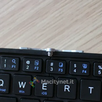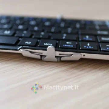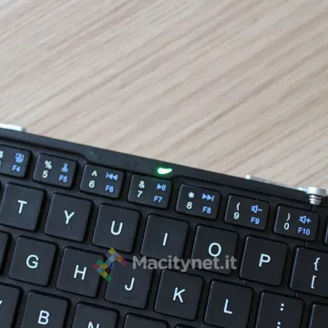 Non ci sono tasti o interruttori per accenderla: basta aprirla per veder illuminarsi per circa 3 secondi, in verde, un LED posto in alto a destra, a conferma del fatto che la tastiera è stata accesa. Quando si chiuderà la tastiera, automaticamente sarà spenta. La stessa spia si accende di rosso quando si collega l’accessorio ad una batteria d’emergenza o ad un alimentatore per la ricarica. Vicino al primo LED ne troviamo un secondo che si accende di verde quando si attiva il Caps Lock, lampeggia invece di blu quando si preme la combinazione di tasti Fn+C (tasto Bluetooth) utile per rendere la tastiera visibile a smartphone e tablet che si desiderano utilizzare in combinazione con essa.