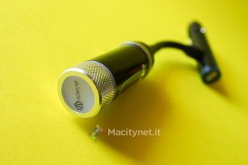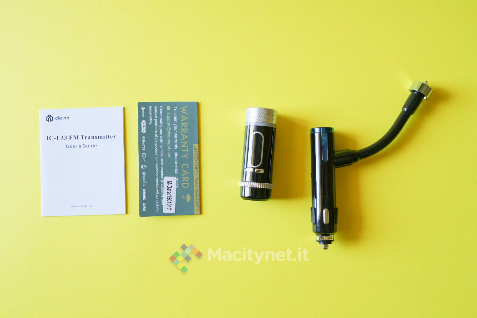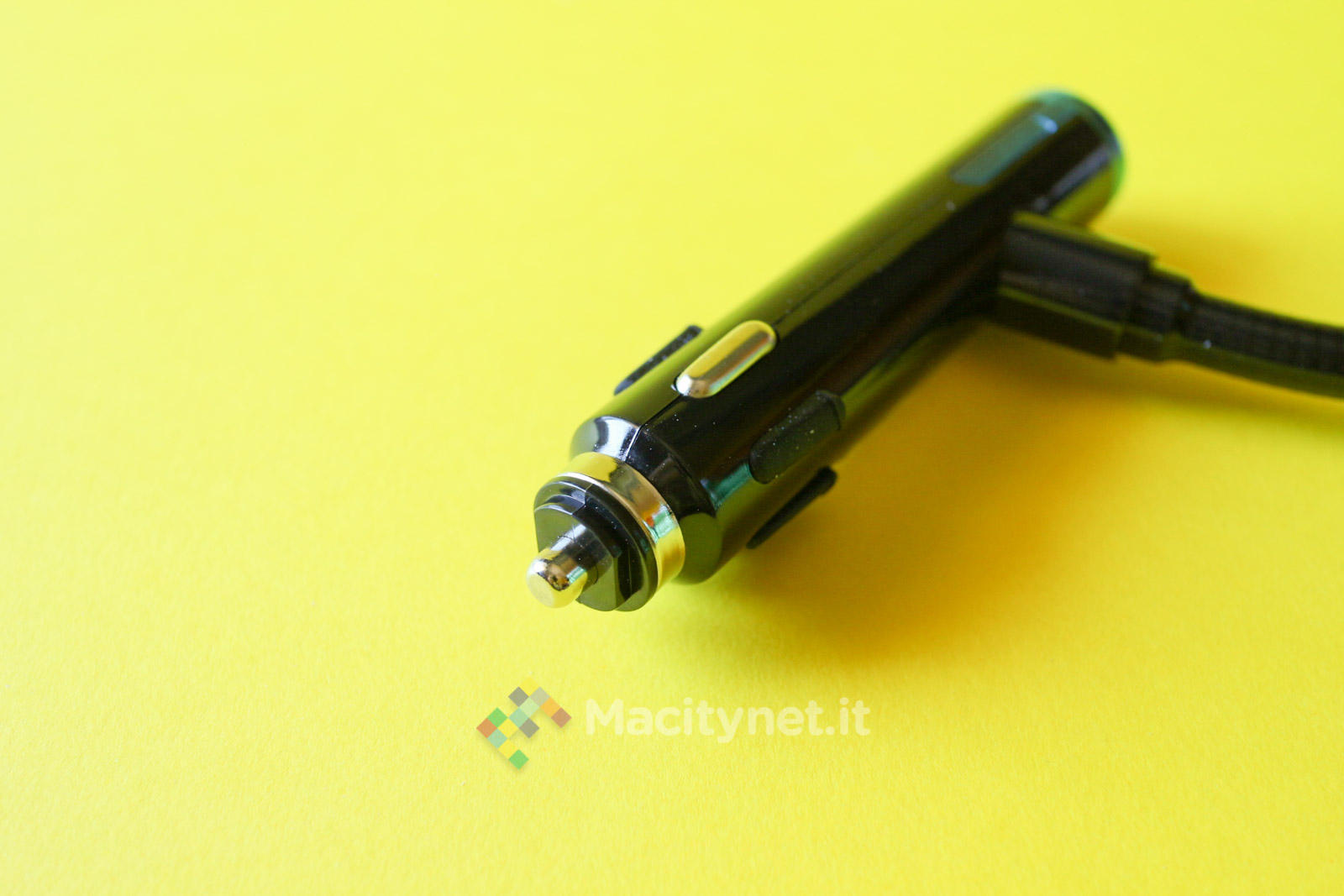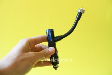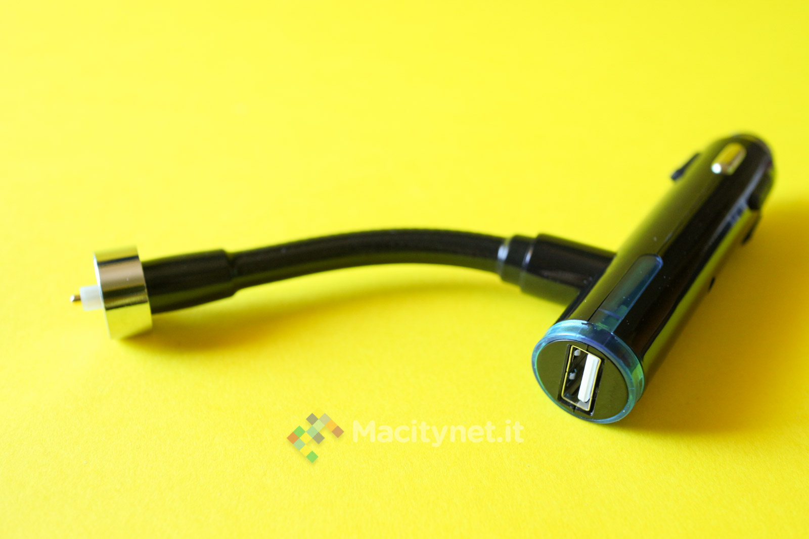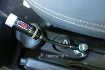 Aperta la confezione di vendita, ci si trova di fronte all’accessorio diviso sostanzialmente in due parti. Nel totale pesano intorno ai 100 grammi: la base è composta dallo spinotto per accendisigari (10 x 1,8 cm) dotata di porta USB per la ricarica di un dispositivo e braccio flessibile ( 11 cm) al quale si aggancia magneticamente il cervello dell’accessorio (7,5 x 2,4 cm) dove troviamo il tasto superiore di accensione, la rotella di volume, la spia LED, lo schermo LCD, il foro del microfono, i tasti FWD, BWD e la rotella per la selezione della frequenza.