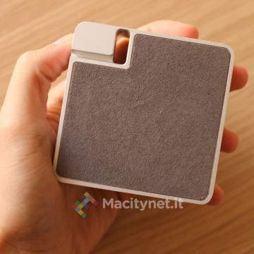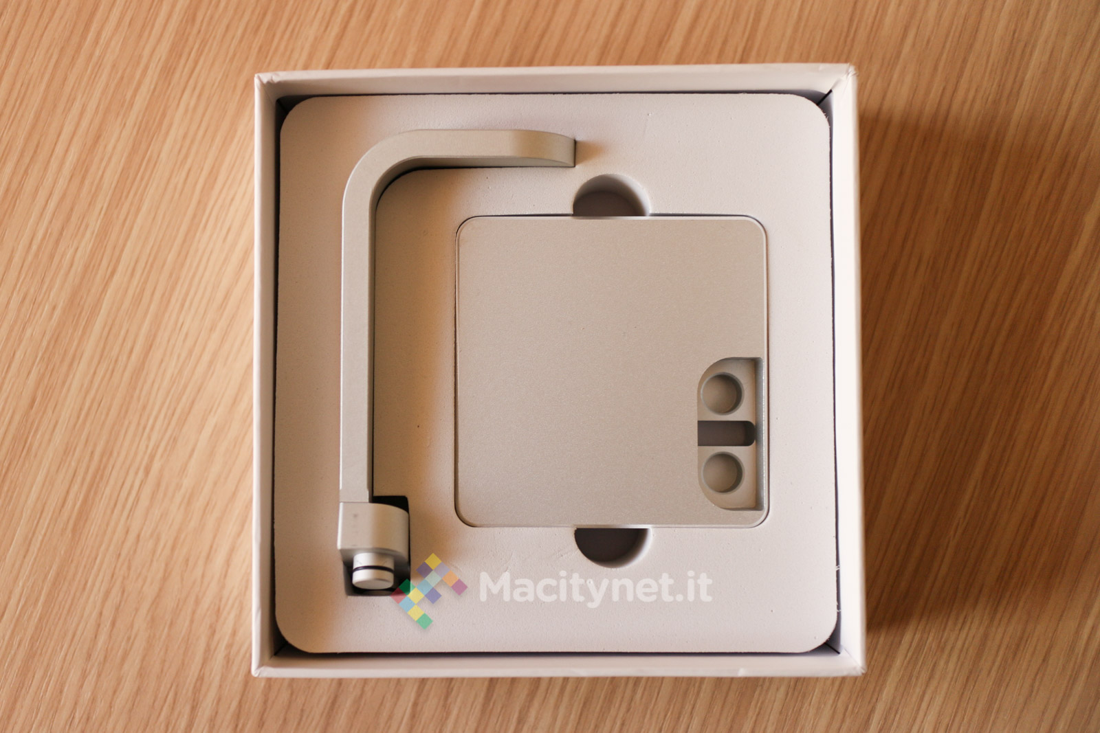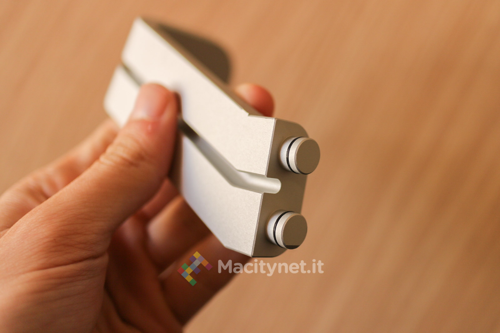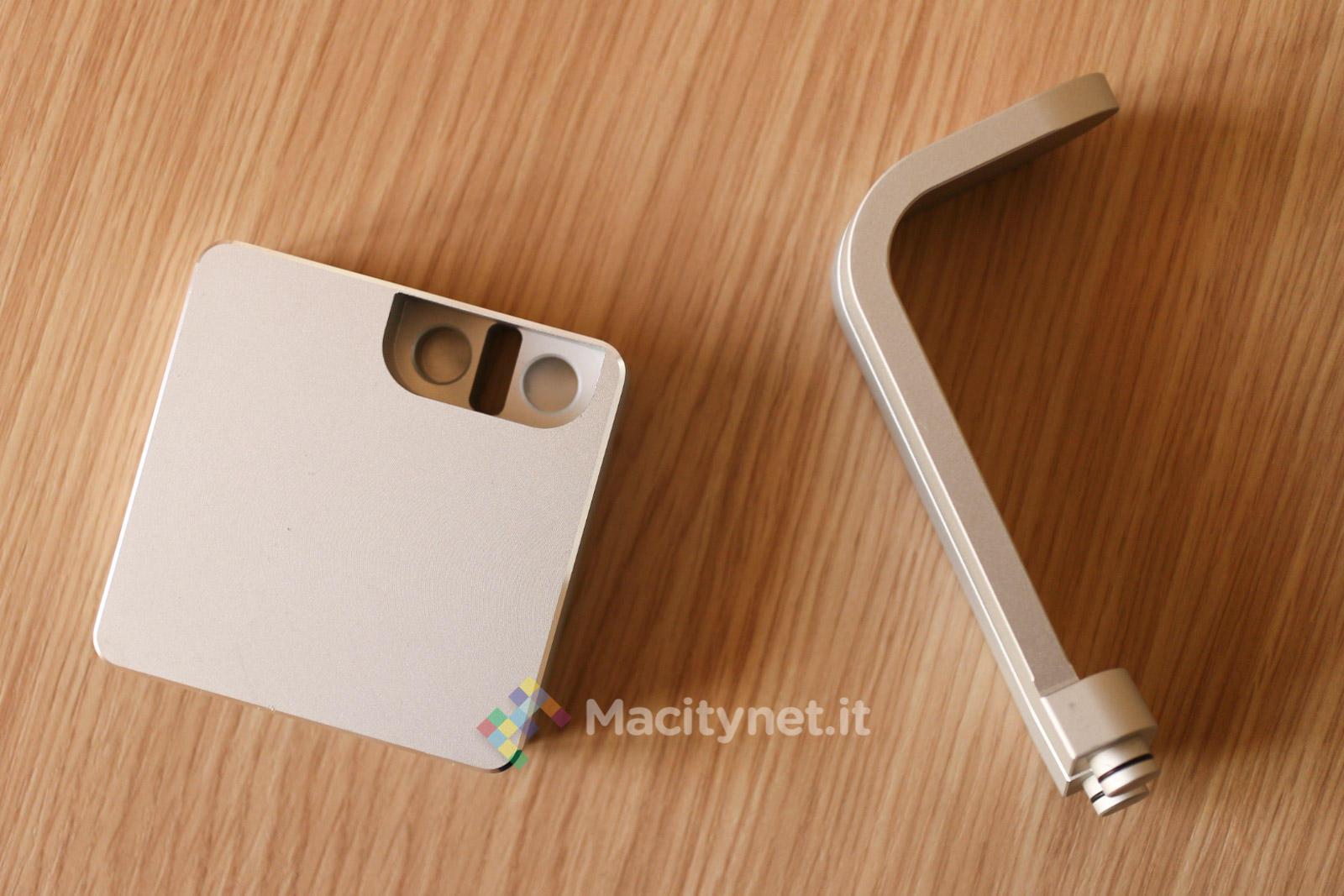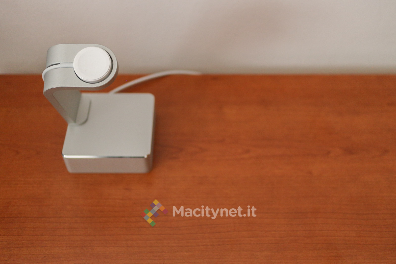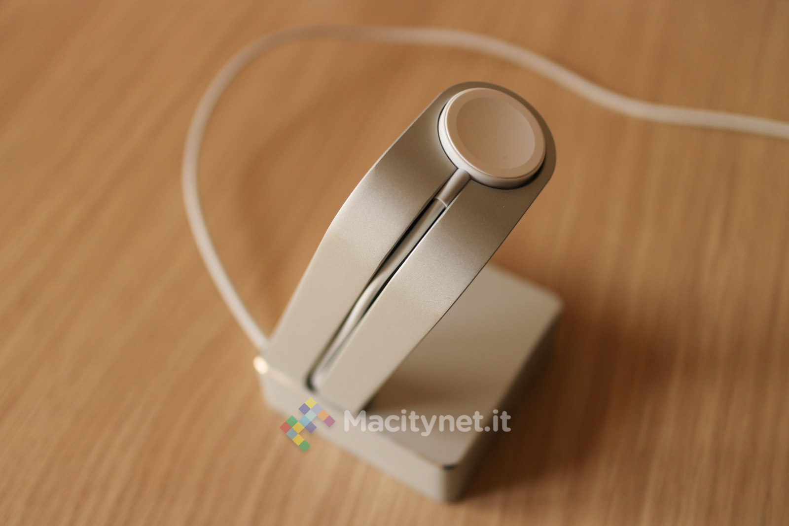 Scatola aperta, ci si trova di fronte a due pezzi realizzati completamente in alluminio. Uno, il braccio che sostiene Apple Watch ed instrada il cavo di ricarica, è apparentemente leggero mentre la base, più massiccia, da tutta l’impressione di essere molto pesante. Lo conferma la nostra bilancia da cucina dove ciascuno pesa rispettivamente 80 e 360 grammi. Le due parti si uniscono tra loro attraverso l’aggancio delle due sporgenze circolari presenti sulla base del braccio, con i fori nella base quadrata. Proprio come se si dovessero unire due mattoncini LEGO, con la differenza che qui ci sono due sottili guarnizioni che evitano di far uscire il braccio accidentalmente. Entrambi sono ben rifiniti, la base ha in aggiunta una levigatura del bordo con un taglio netto di 45 gradi che riflette la luce e ricorda per certi versi la bordatura di iPhone 5/5s. Al di sotto troviamo inoltre uno strato in panno che evita il contatto dell’alluminio con la superficie dove viene poi appoggiata. Questo fa sì che non venga graffiato il comodino.