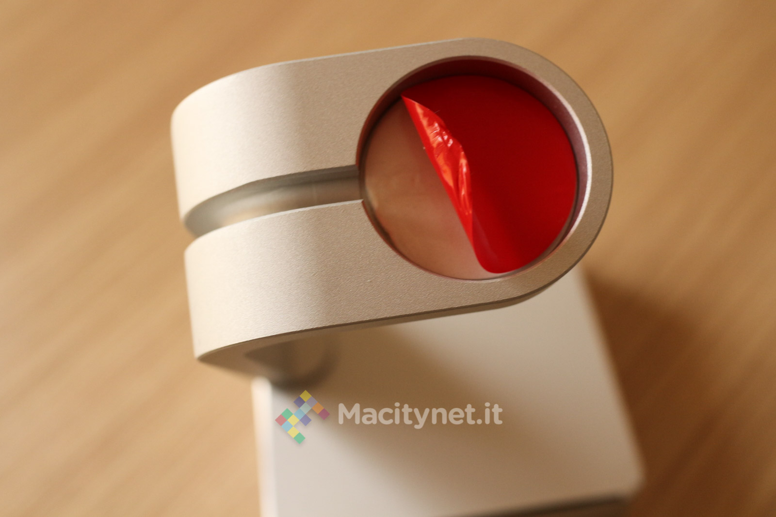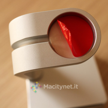 Prima di unire le due parti è necessario collegare il cavo di ricarica dell’Apple Watch. E’ sufficiente sollevare e rimuovere la protezione adesiva (in rosso) presente nell’apposito alloggiamento per la piastra magnetica, quindi adagiare quest’ultima in posizione per lasciare che l’adesivo appena scoperto la tenga ben salda alla struttura. A questo punto è importante far scivolare il cavo all’interno dell’apposita scanalatura, quindi infilare il connettore USB nel foro rettangolare della base. Per finire, va incastrato il braccio nella base, quindi si stende per bene il cavo e lo si blocca definitivamente nella fessura a L situata proprio sotto la base quadrata. Più facile a farsi che a dirsi, in poche decine di secondi il dock è montato e pronto all’uso.