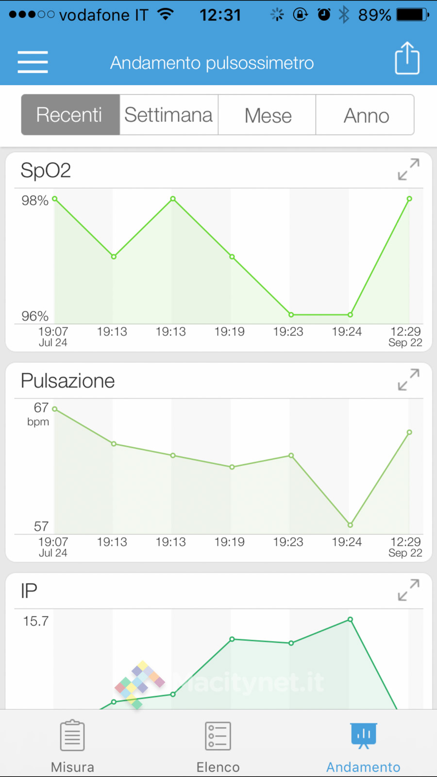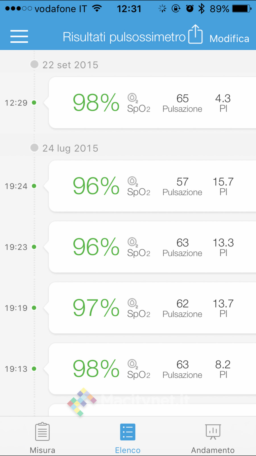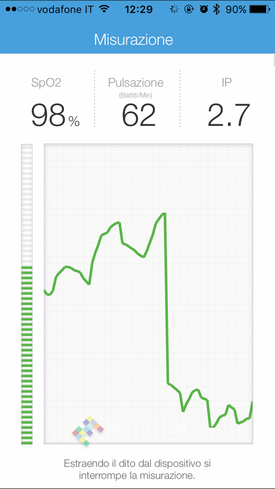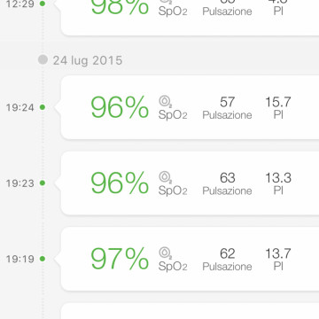 A misurazione effettuata, è sufficiente togliere il dito: immediatamente verrà interrotta ed il valore medio sarà salvato nella memoria del pulsiossimetro. Possono essere memorizzate fino a 100 misurazioni, oltre questo numero le nuove andranno a sovrascrivere le vecchie. Grazie all’applicazione su iPhone e iPad ed al collegamento Bluetooth, è possibile salvare le misurazioni fatte in precedenza così da non perderle. Le misurazioni possono anche essere effettuate con il dispositivo iOS collegato tramite Bluetooth: in quel caso sullo schermo di iPhone e iPad verrà mostrato il tracciato/andamento della pulsazione (curva pletismografica) anche in tempo reale.
