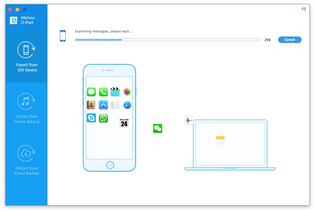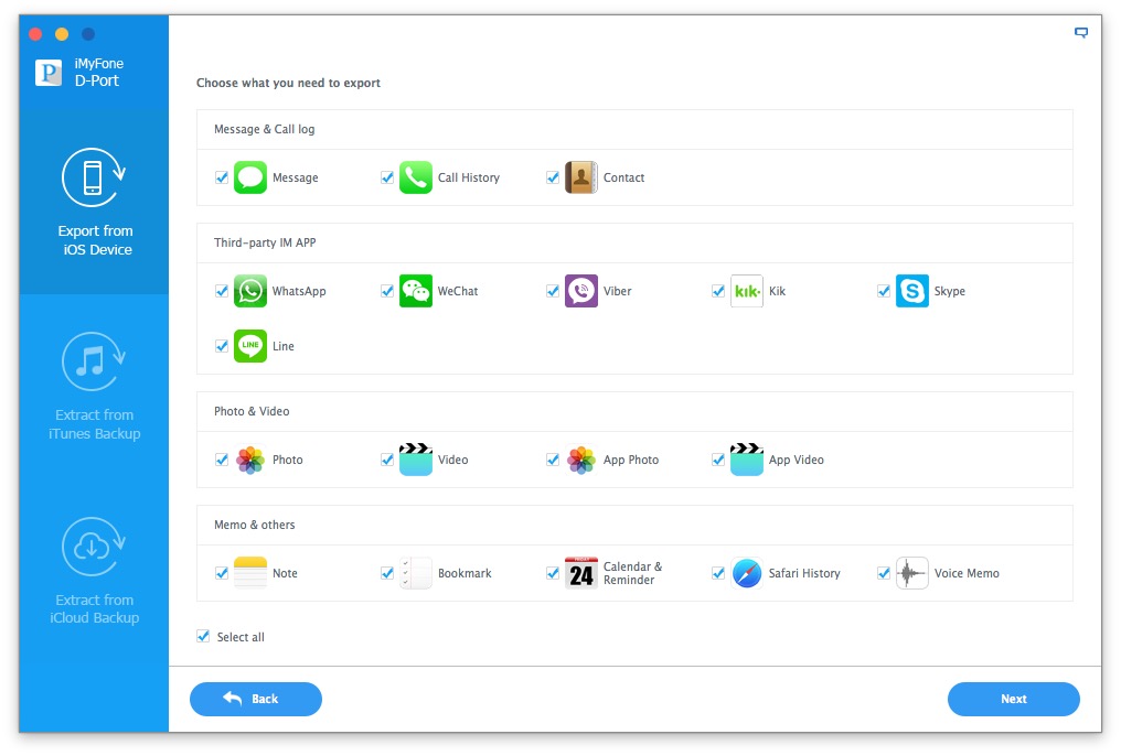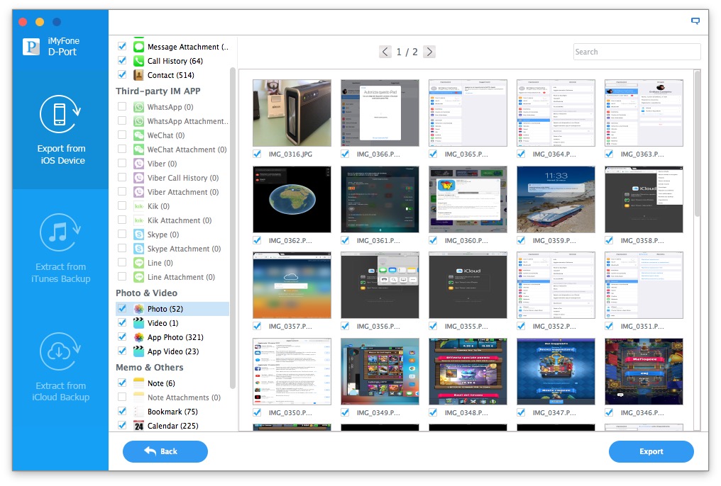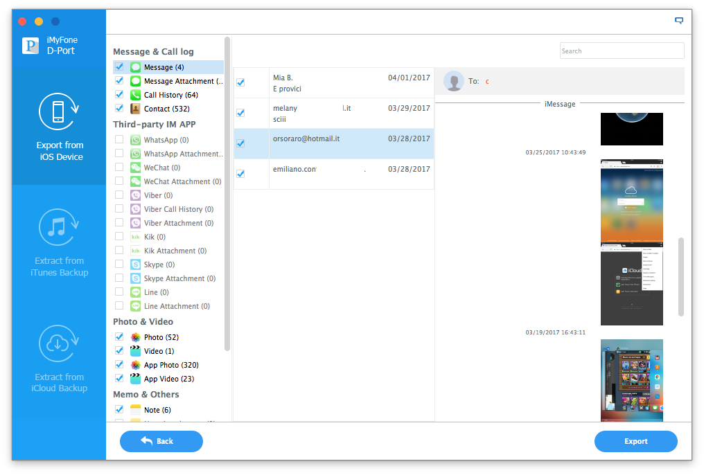 Dopo aver selezionato dispositivo, iTunes o iCloud, si potranno scegliere i file da estrapolare e salvare su PC o Mac. Per quel che concerne la sezione Chiamate e Messaggi, sarà possibile copiare su PC e Mac il registro chiamate, i messaggi e i contatti. Tra le possibilità di estrapolare il contenuto dei messaggi non vi è solo accesso all’app iMessage di Apple: iMyFone D-Port consente, infatti, di copiare il contenuto delle conversazioni WhatsApp, WeChat, Line, Viber, Kik Messenger e Skype. Da questo punto di vista, insomma, si è completamente coperti, considerando che la lista di questi applicativi copre il 90% delle app di messaggistica più utilizzate, anche se manca, purtroppo, il supporto a Telegram.