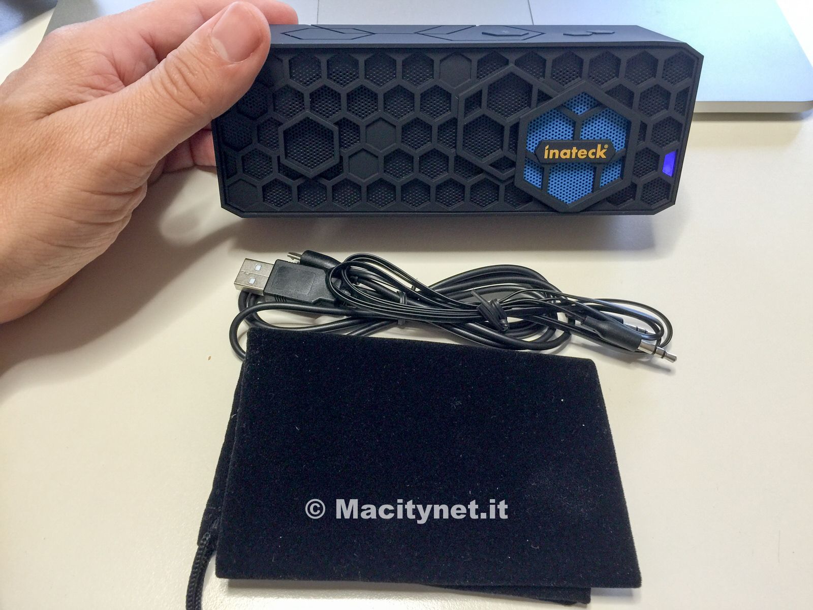 Al primo utilizzo è necessario “accoppiare” il dispositivo; per farlo basta tenere premuto il pulsante Bluetooth per sei secondi: la luce sulla parte frontale lampeggia; sul Mac basta avviare Impostazione Assistita Bluetooth, ricercare il dispositivo e selezionarlo nell’elenco che compare (viene visto alla stregua di una cuffia). Da questo momento in poi è possibile dirottare l’audio sullo speaker selezionandolo dalle Preferenze Suono. Similarmente, sui dispositivi iOS è bastato attivare il Bluetooth e dalle impostazioni abbinare il dispositivo “Inateck”. Oltre che per riprodurre filmati e brani musicali, con i dispositivi iOS è possibile sfruttare la periferica come sorgente audio anche durante le telefonate (ottenendo, grazie al microfono incorporato, un potente sistema viva voce). Sono ovviamente supportati anche PC, tablet e qualsiasi altro dispositivo che gestisce l’uscita Bluetooth (quelli che richiedono eventualmente una password sono abbinabili usando codice “0000”).