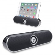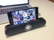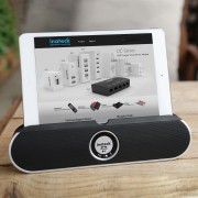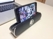 Il dispositivo arriva a casa in una scatola di cartone piuttosto semplice all’interno del quale troviamo un sintetico manuale, un cavo Micro USB per ricarica, un cavo per il collegamento analogico. L’altoparlante vero e proprio è abbastanza piccolo, anche se per ovvie ragioni (deve sostenere un tablet) non piccolissimo: 28,2 x 10,6 x 7,2 cm. È realizzato in gran parte in plastica lucida, anche se la parte superiore dove si trova la scanalatura per collocare un iPad o un qualunque tablet e anche Phablet (funziona perfettamente dal punto di vista dimensionale con un iPhone 6 Plus), è bordata in gomma. La griglia frontale è in metallo; intorno troviamo un bordo in plastica argentata. Sul retro c’è un supporto estraibile, che dovrà essere usato per dare maggior stabilità alla cassa quando si fruisce della cassa, come accennato, in funzione supporto. L’impressione generale è che si tratta di un prodotto realizzato sicuramente con un occhio al costo, ma che riesce a ridurre il prezzo facendo ricorso ad una semplificazione del design e ad un occhio attento sui materiali non troppo ambiziosi, ma non di bassa qualità. Stilisticamente, infine, siamo di fronte ad un dispositivo non troppo originale, ma comunque piacevole da vedere e anche da collocare su un comodino, una scrivania o in una sala.