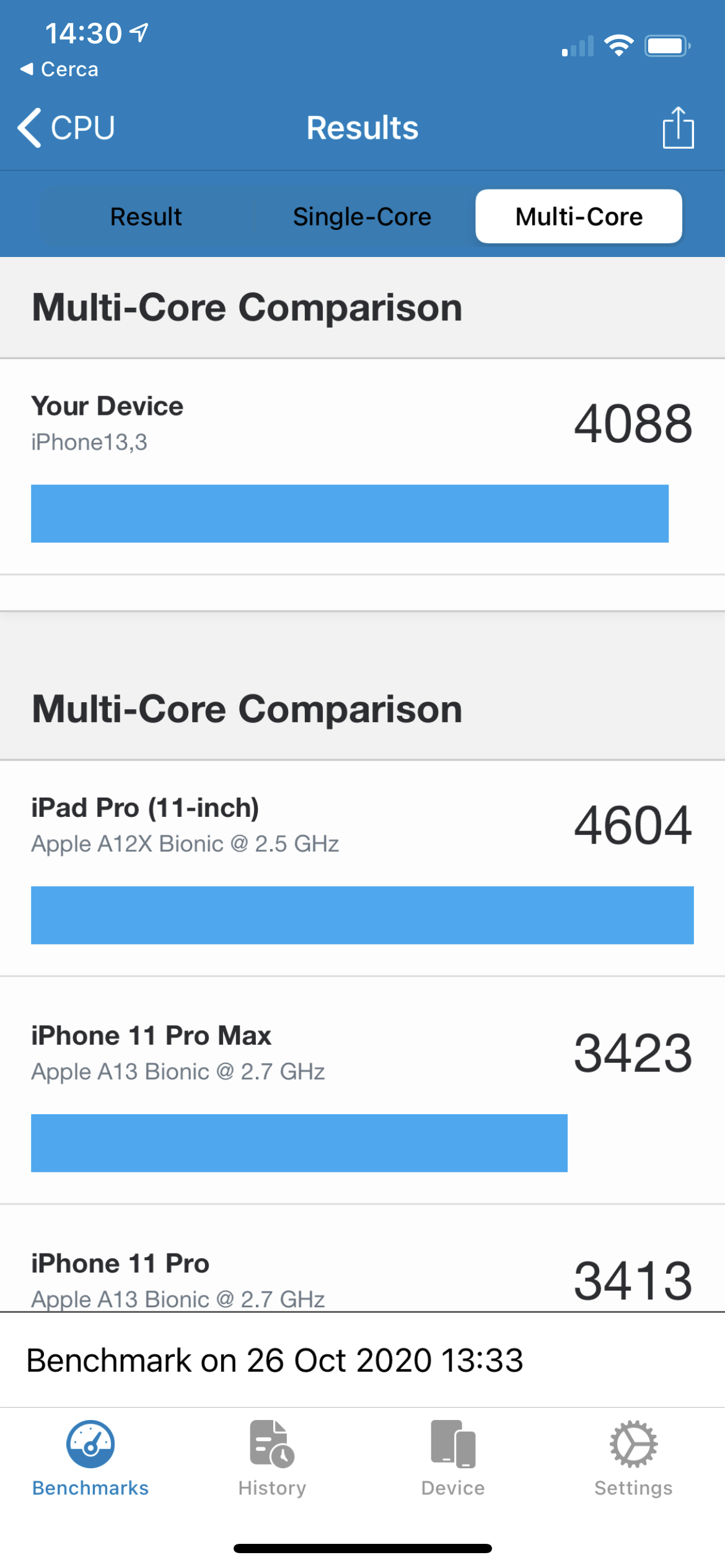 Non sappiamo se siamo stati fortunati o se Geekbench deve ancora essere ottimizzato, quindi se siano più precisi i nostri dati o quelli di altri siti. Nel quotidiano iPhone 12 Pro sembra in effetti più fluido e reattivo di iPhone 11 Pro ma in definitiva quel che il modello attuale fa bene, lo faceva bene anche il precedente. Così che allo stato attuale ci sono ben poche occasioni in cui il possessore di un iPhone 11 Pro rimpiangerà di non avere un iPhone 12 Pro usando come presupposto le prestazioni. Forse solo con giochi particolarmente pesanti (leggiamo di un 10% di guadagno sui frame in alcune occasioni) e forse ancora di più in futuro con specifiche ottimizzazioni, questo non sarà più vero.