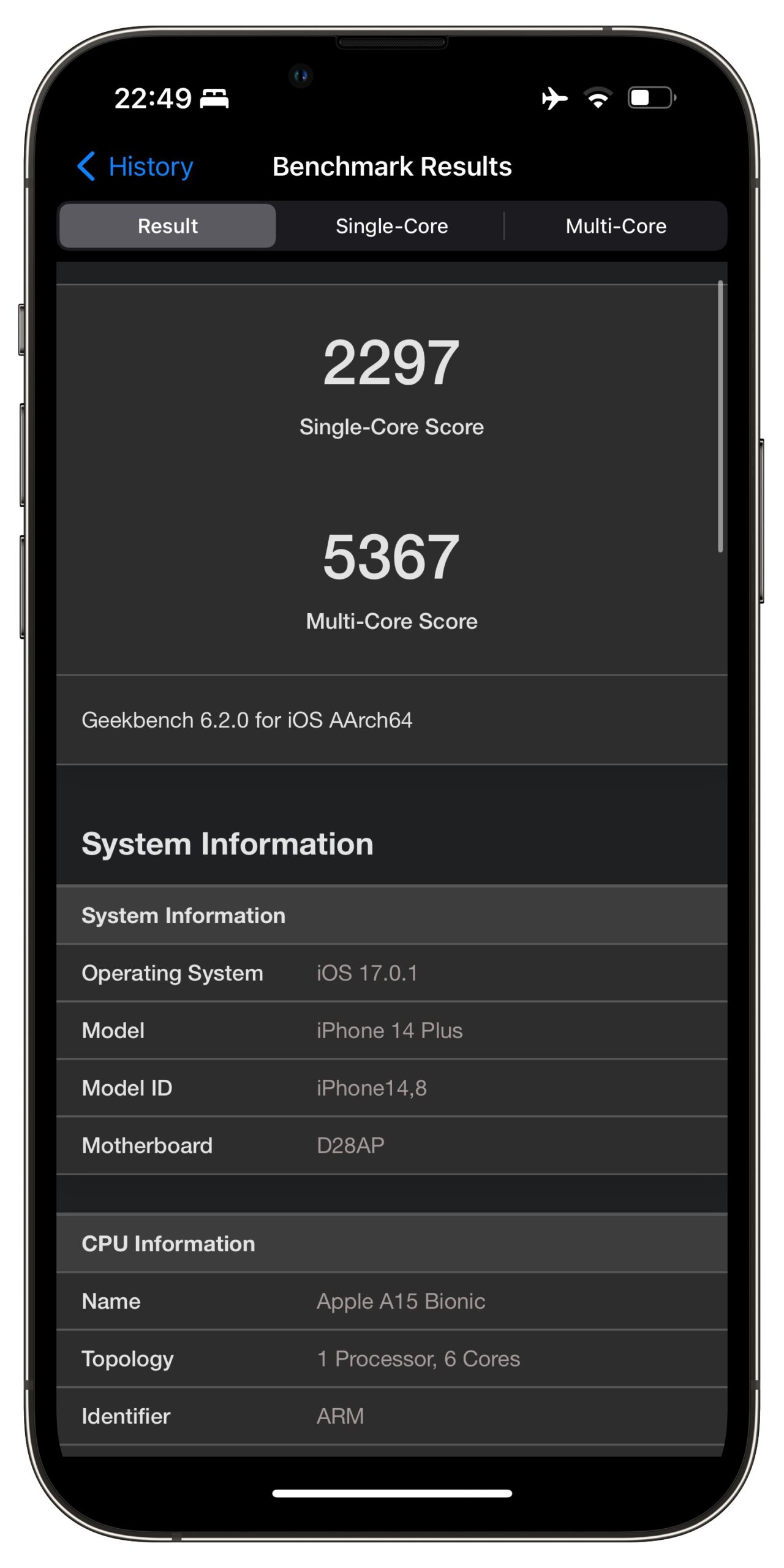 I nostri benchmarks confermano che A16 è un significativamente più veloce di A15 anche se, almeno nel nostro caso, ancora più lento dell’A16 di iPhone 14 Pro.