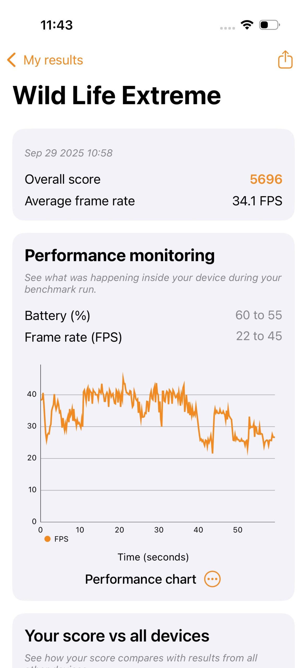 Nei test che vedete in queste pagine l’A19 Pro mostra punteggi molto elevati, o meglio, non sorprendentemente, i più elevati mai visti nel mondo iPhone. Li trovate esplicitati sia nei numeri di GeekBench (da notare il mostruoso +40% in prestazioni nel metal score) che in quelli di 3DMark (+10 frames al secondo di media in WildLife Extreme).