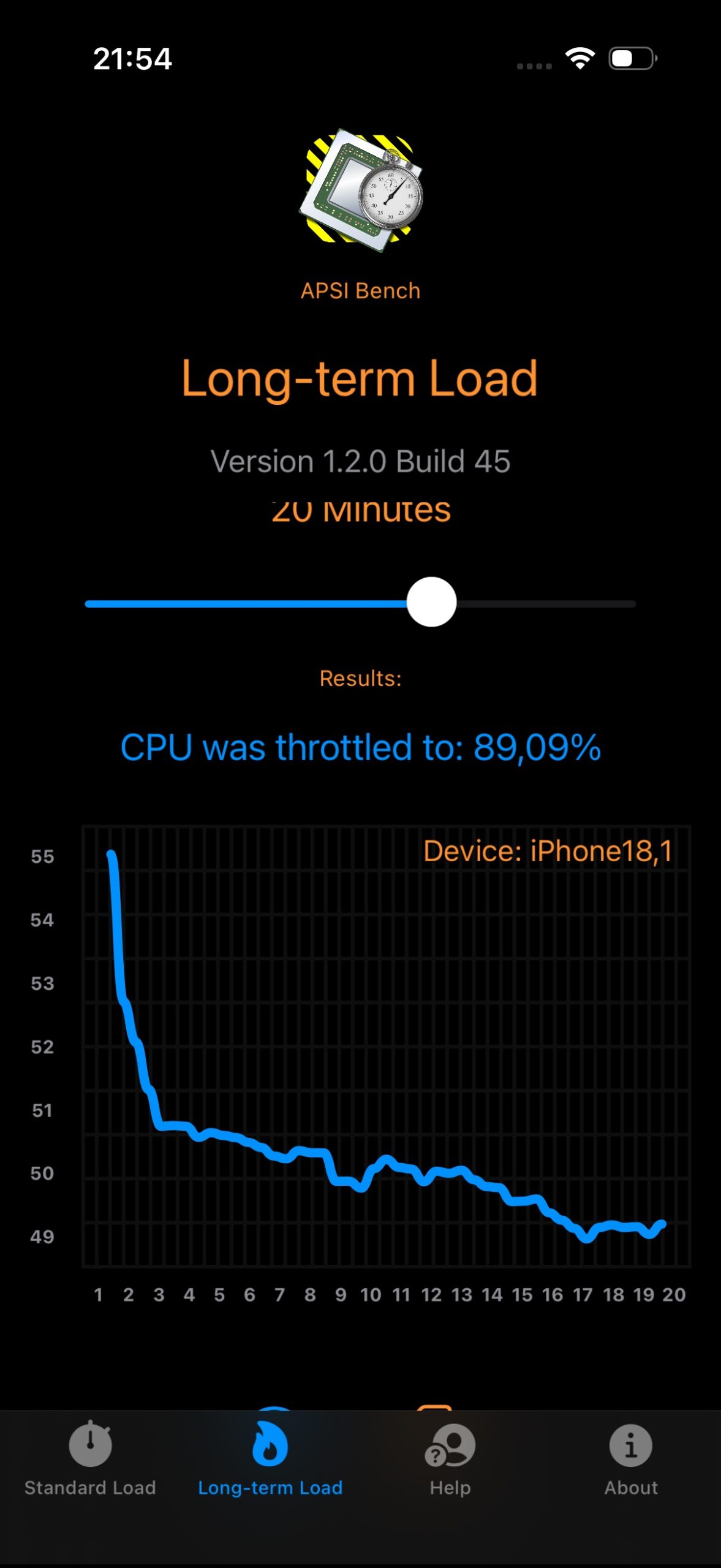 Apsi Bench,  misura la riduzione di prestazioni sotto stress della CPU e ci dice cose simili. Quelle di iPhone 17 Pro vengono tagliate, sul ciclo di 20 minuti, all’87% più o meno quanto quelle di iPhone 16 Pro. Ma qui parliamo di una CPU che offre prestazioni largamente migliori.