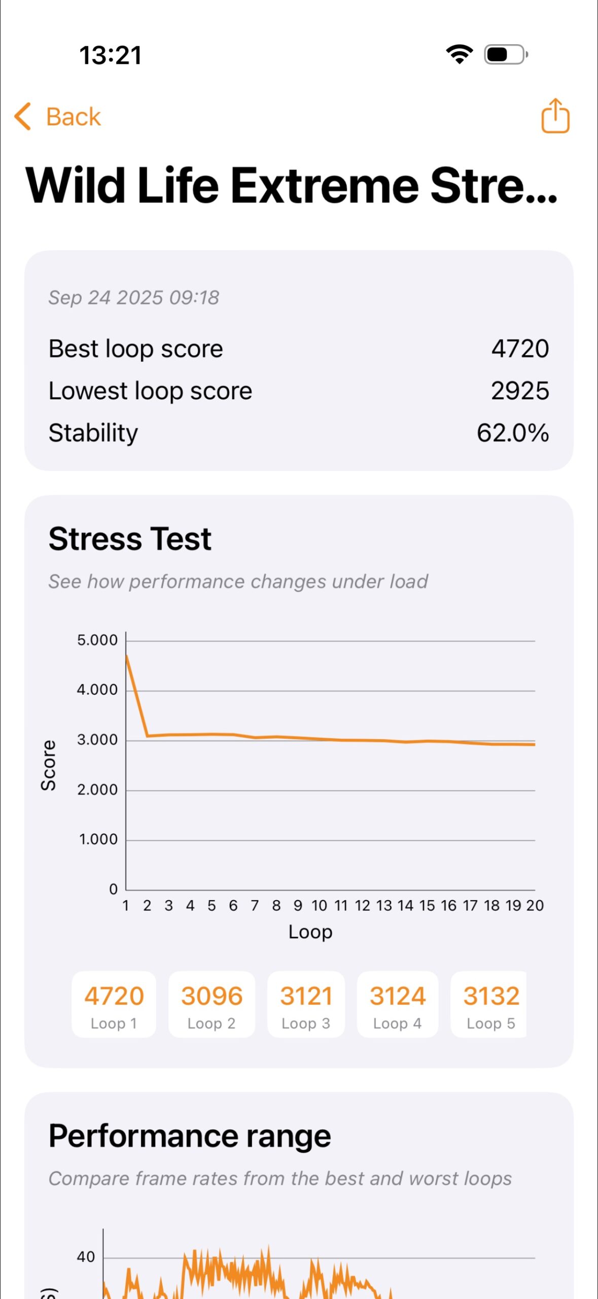 iPhone Air, invece, perde subito prestazioni ma poi resta più o meno allo stesso livello. Al termine dello stress test si ottiene un dato di stabilità del 62%, non entusiasmante ma comunque migliore di quello di iPhone 16 Pro.
