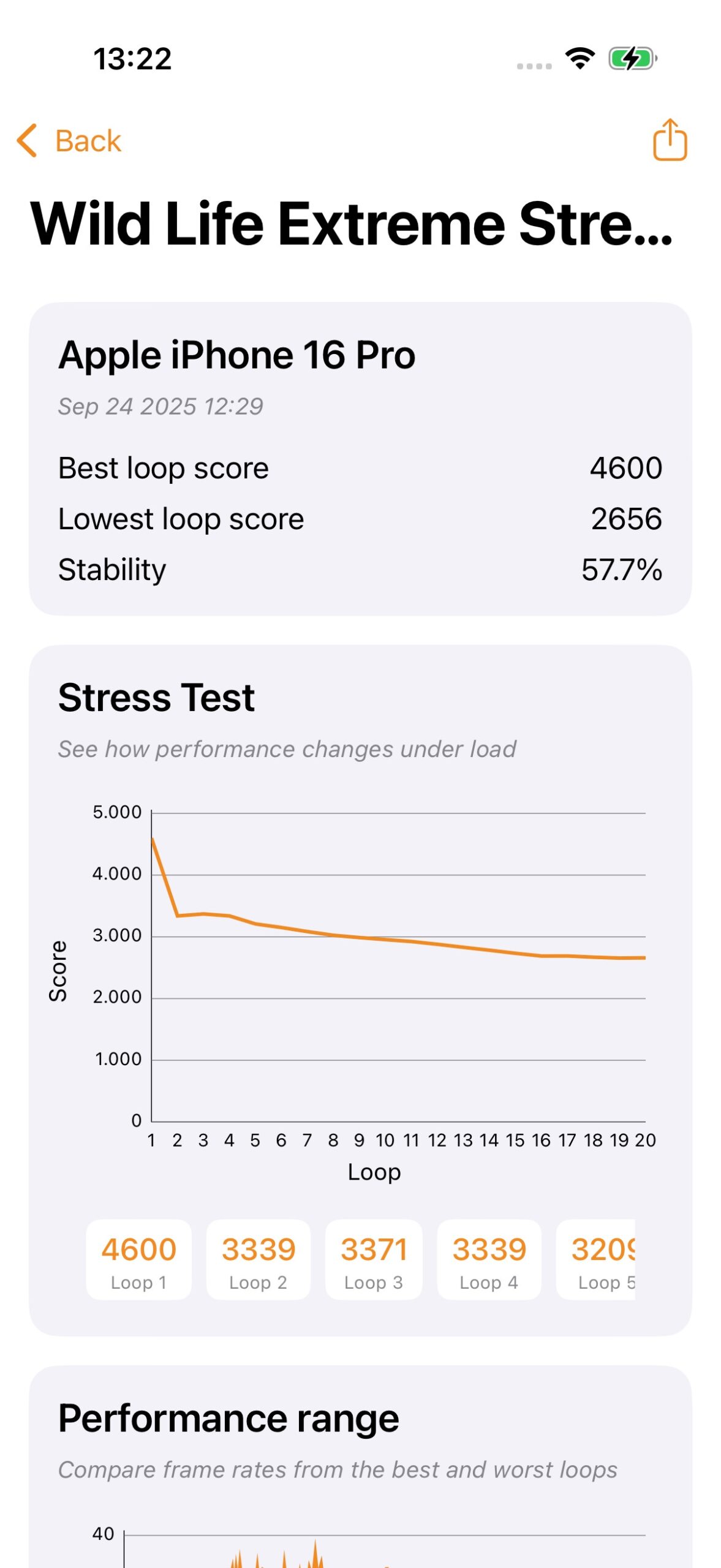 Il 16 Pro perde potenza in maniera più graduale ma anche più significativa, scendendo a ogni ciclo. Alla fine riporta un dato di stabilità del 57,7%, segno di un surriscaldamento importante e conferma che il titanio e il vetro avevano più di un problema a gestire il calore di A18 Pro.