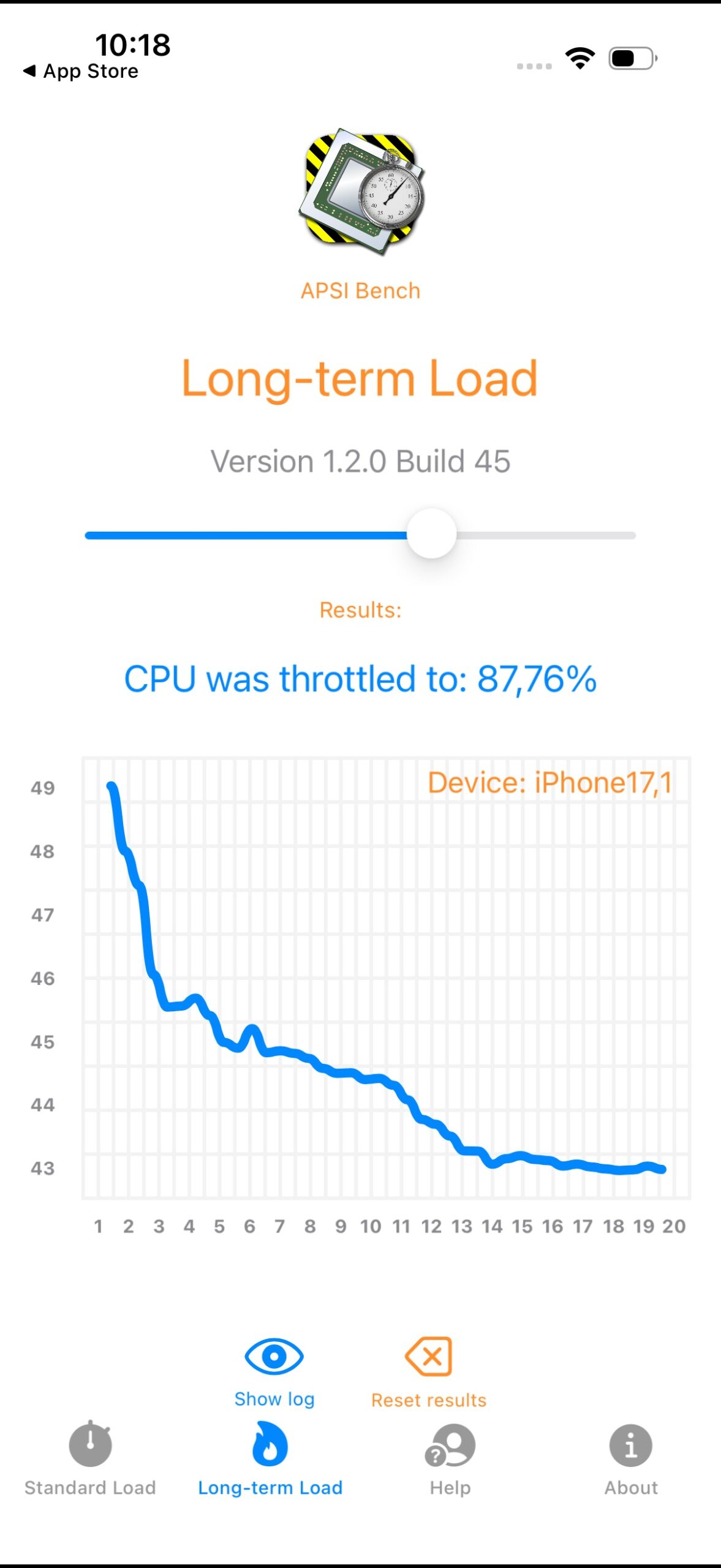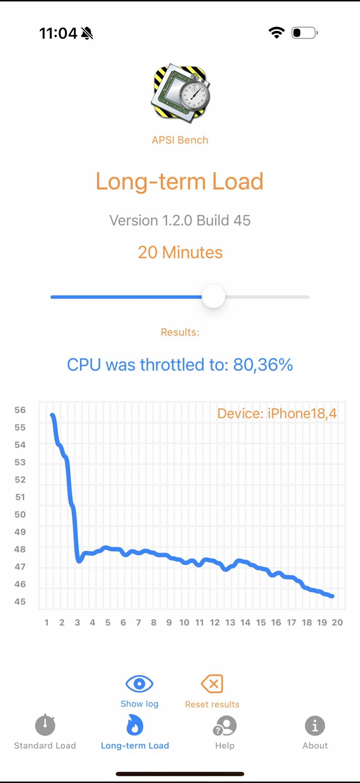 I dati rilevati da Apsi Bench, che misura la riduzione di prestazioni sotto stress, forniscono indicazioni simili. Le prestazioni della CPU di iPhone Air vengono tagliate, sul ciclo di 20 minuti, all’80,36%: restano ancora abbastanza buone. iPhone 16 Pro riduce le prestazioni all’87%, facendo un pochino meglio.