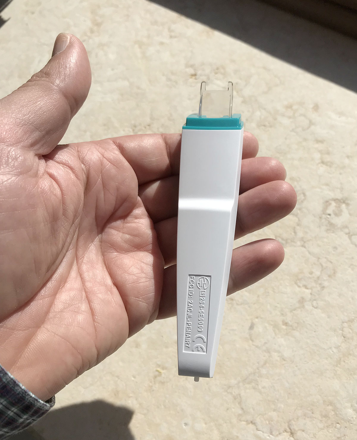 Sulla parte superiore dello scanner (che è di colore bianco e mentre la zona della punta è verde acqua) è presente un gommino che è possibile togliere per rivelare la porta che consente di attaccare il cavo USB per la ricarica (incluso).