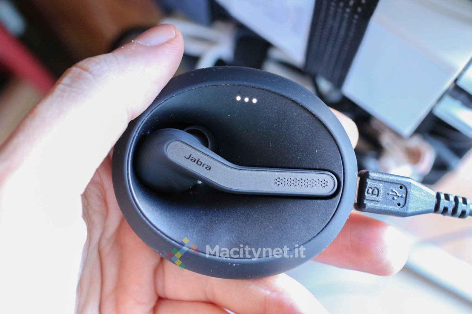 Per la batteria comunque, anche il LED incorporato nell’auricolare aiuta a farsi un’idea di quando è il momento di ricaricarlo: se lampeggia di verde, potrebbe esserci tra il 20% e il 100% di energia residua, rosso invece indica una quantità inferiore al 20%. Sulla custodia ci sono invece tre indicatori LED, di colore bianco, che informano sulla quantità di energia presente nella batteria incorporata. Una sola luce rappresenta lo 0-33%, due una quantità compresa tra 33 e 66%, tre luci da 66% a 100%. A completare la lista di funzioni utili c’è l’opzione “Find my Jabra” disponibile all’interno dell’applicazione. In pratica, se si attivano i servizi di localizzazione, l’app è in grado di memorizzare l’ultima volta che è stato “visto” l’auricolare, segnando la posizione sulla mappa. Ciò significa che se per una distrazione lasciamo l’auricolare al bar o ci cade dalla tasca, non appena si allontanerà di oltre 10 metri dal telefono, l’app aggiungerà un pin sulla mappa, dando così buone probabilità al proprietario di recuperare l’auricolare.