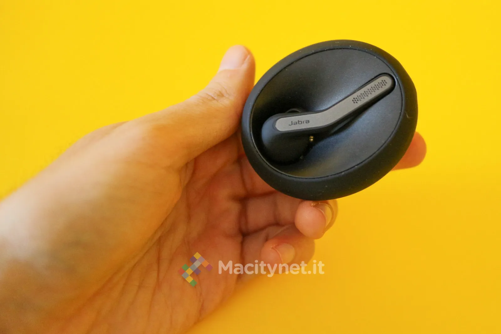 Un’altra domanda che sorge vista l’assenza di tasti e pulsanti è: come si risponde o si termina una chiamata? Ebbene, se l’auricolare è infilato nella custodia, basta sganciarlo per rispondere automaticamente alla chiamata. In pratica se lasciate “il sasso” nella tasca dei pantaloni, ricevete una chiamata e dal telefono (o da Apple Watch se ne avete uno) leggendo il nome dell’utente in chiamata decidete di rispondere, non dovrete far altro che mettere la mano in tasca, tirare fuori l’auricolare ed infilarlo nell’orecchio. Un gesto del tutto naturale, come quando ai tempi del telefono di casa con filo era necessario alzare la cornetta per rispondere ad una telefonata. Allo stesso modo, per riagganciare al termine della chiacchierata, non dovrete far altro che re-infilare l’auricolare nella custodia. Il bello arriva quando la chiamata in entrata si presenta con l’auricolare già infilato nell’orecchio. In questo caso la voce dell’assistente vi informerà che c’è una chiamata in arrivo annunciando nome e cognome del contatto se presente in rubrica, oppure leggendo semplicemente il numero di telefono quando si tratta di un nuovo contatto. A quel punto seguirà un segnale acustico dopo il quale dovrete semplicemente dire “Rispondi” per rispondere, oppure “Ignora” per rifiutare la chiamata. Al termine di una telefonata poi, se vorrete lasciare l’auricolare nell’orecchio, non dovrete infilarlo nella custodia per riagganciare: è sufficiente un doppio-tap sulla superficie piatta dell’auricolare nella parte alta, quella più vicina alla cavità auricolare. Il manuale parla di “sfiorare”, in realtà è necessario assestare un doppio tocco piuttosto deciso. Lo stesso gesto, quando non c’è alcuna chiamata in corso, richiama l’assistente vocale Siri su iPhone e Google Now su Android, mentre un triplo tocco risveglierà l’assistente Jabra per ricordarvi, in termini di minuti residui in conversazione, l’autonomia della batteria restante.
