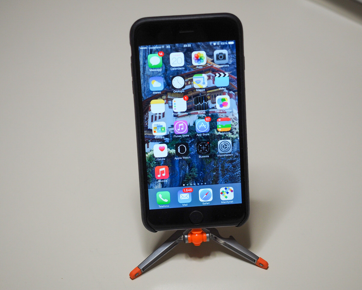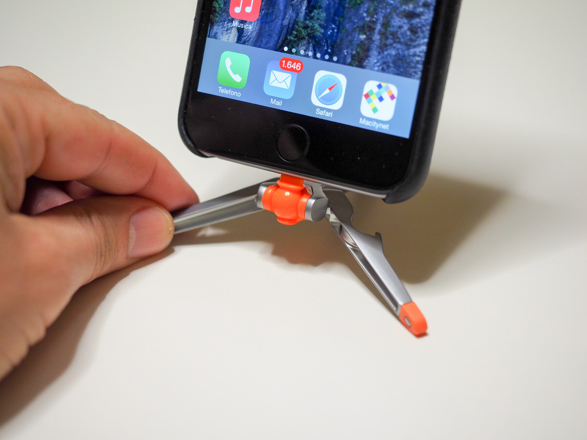 Il cavalletto è veramente molto piccolo, molto ben fatto. Lo zinco non è alluminio, ma l’impressione è ottima e ottimi sono anche gli altri materiali. Si tratta di un oggetto perfetto per tutte quelle situazioni dove si vuole stabilizzare il telefono non solo per foto e video, ma anche per gestire videochiamate in FaceTime, guardare un film ed in generale in tutte quelle situazioni dove mantenerlo inclinato in una posizione senza doverlo sostenere con le mani può essere comoda.