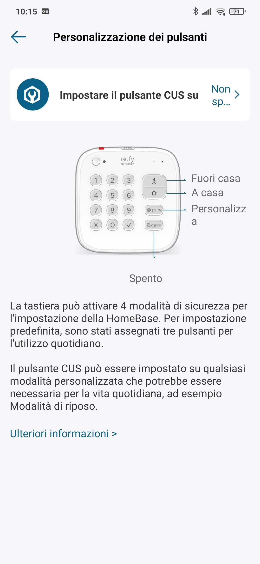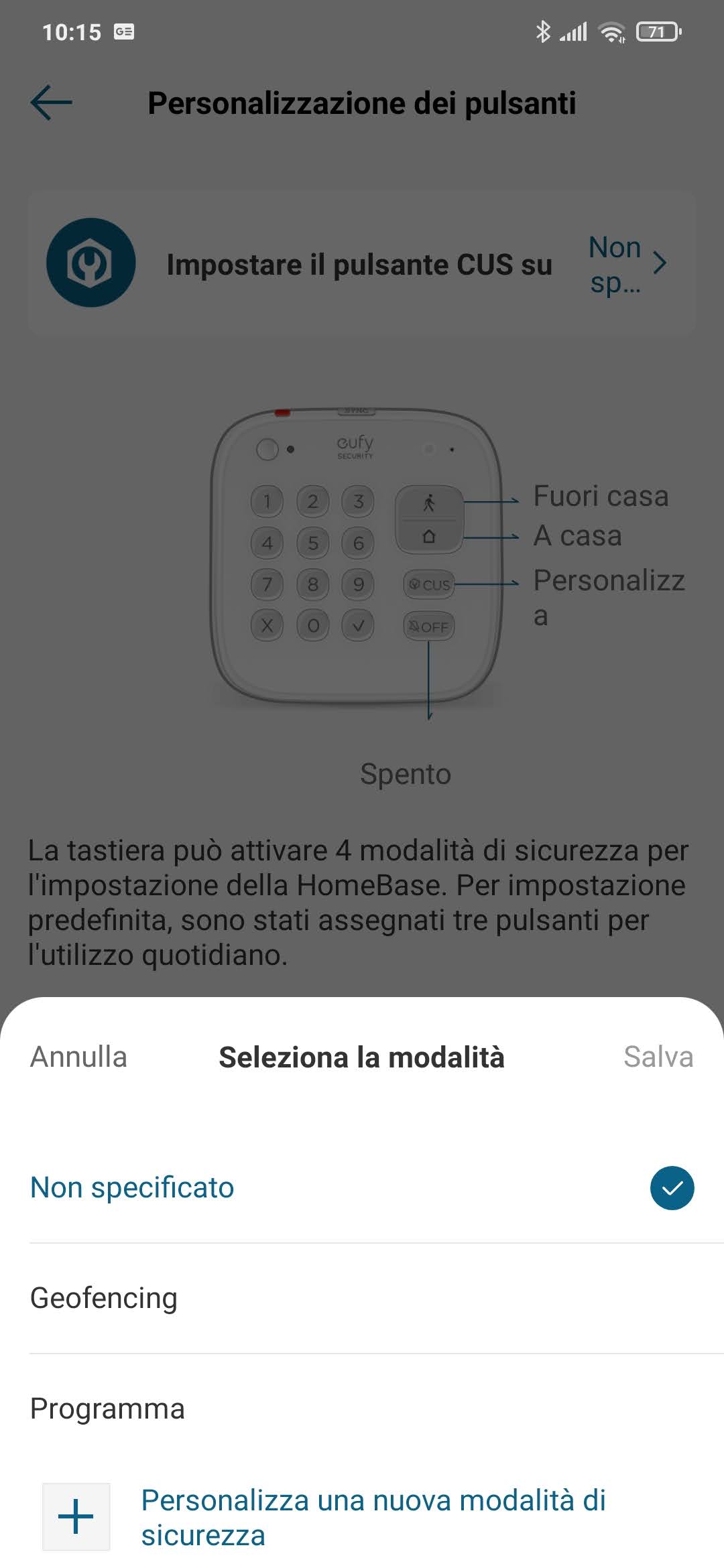 Attivare le diverse modalità di sicurezza è estremamente semplice: è sufficiente inserire il PIN e cliccare sui pulsanti “Casa”, “Fuori Casa”, “Cus” e “Off”. Le modalità Casa e Fuori Casa sono quelle che attivano le impostazioni di sicurezza così come impostate nell’app Eufy. Cus attiva una modalità personalizzata, dove l’utente ha impostato diverse opzioni per tutte e periferiche collegate al sistema di video sorveglianza Eufy. Si tratta di una impostazione interessante, che consente ad esempio di impostare una modalità “Notte”. Se con “Fuori casa si ipotizza l’accensione di tutti i sensori e di tutte le telecamere, una modalità notte potrebbe ad esempio allarmare solo determinati sensori, lasciando spenti telecamere e sensori presenti nella camera da letto.