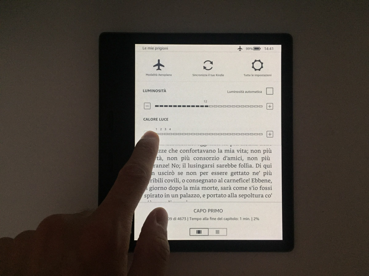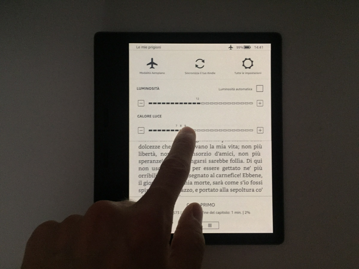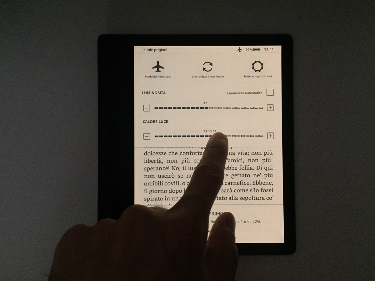 Per farlo basta aprire le impostazioni dalla barra superiore e, insieme allo slider che consente di regolare l’intensità luminosa, ne compare un secondo denominato “calore luce”. Impostando il selettore sullo zero si ottiene la stessa tonalità fredda che contraddistingue la luce di tutti gli altri Kindle ad oggi esistenti mentre via via che lo si porta a valori più alti (fino al numero 24 che è il livello massimo configurabile) viene introdotta una dominante arancio-giallognola che va a virare per l’appunto la temperatura colore della luce su tonalità più calde.