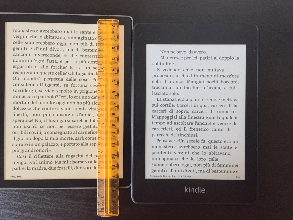 Per rendere l’idea, nella stessa inquadratura di alcune fotografie abbiamo inserito lo schermo del Kindle insieme alle pagine di un vecchio libro (stampato nel 1974, le pagine presentano il tipico ingiallimento dovuto al naturale decorso della carta) che stavamo leggendo proprio nel periodo antecedente questa prova. La sovrapposizione è millimetrica: con il giusto livello di luminosità e di temperatura colore l’effetto della carta ingiallita si può finalmente riprodurre anche sul Kindle, un vantaggio che si apprezza maggiormente al chiuso e in tarda sera, quando soprattutto ci si corica a letto e si vuole conciliare il sonno con un buon libro (con la luce ambrata in effetti il desiderio di dormire arriva prima).