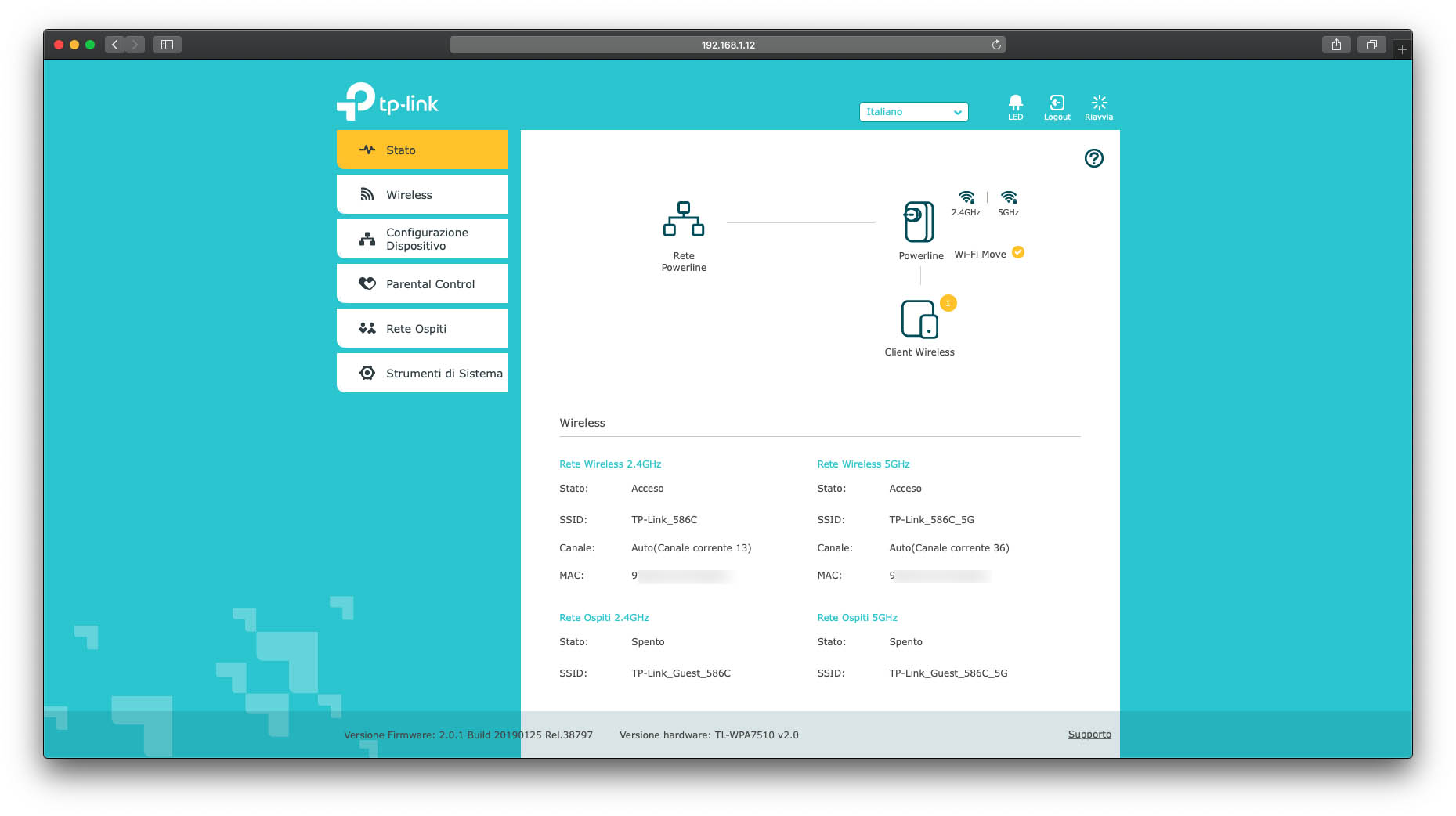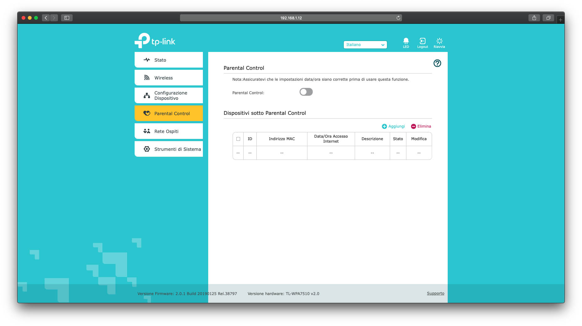La sezione “Parental Control” consente di bloccare siti web inappropriati e limitare l’accesso a internet in determinate ore del giorno. Se di dispone di più dispositivi powerline, le impostazioni possono essere sincronizzate con gli altri. Molto interessante è la “Rete Ospiti”, opzione che, come il nome lascia intuire, permette di avere una rete wireless separata con nome SSD e password separati che gli ospiti possono utilizzare per accedere a internet. È possibile consentire agli ospiti di “vedersi” tra loro, disabilitare funzioni (impedire agli ospiti di apportare modifiche), disabilitare automaticamente la rete dopo tot minuti.