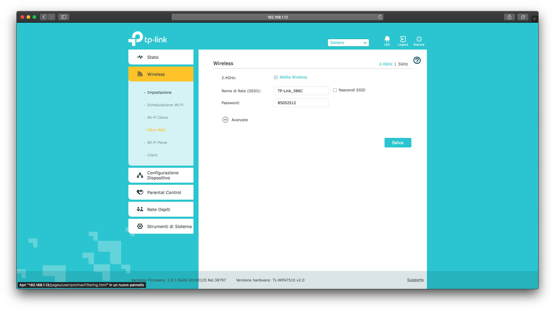Dal computer (o iPad, iPhone o altro dispositivo) nell’elenco delle reti WiFi vedremo due SSID: “Tp-Link_586C” e “TP-Link_586C_5G”. Selezionando una delle due reti, viene richiesta la password (quella dei default è riportata sul dispositivo) e subito navigare sul web senza problemi.