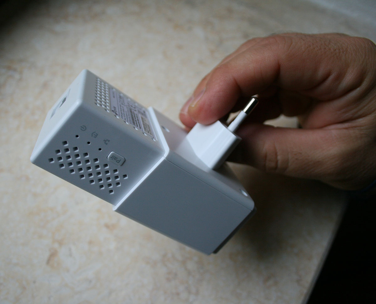 All’interno della confezione, troviamo semplicemente i due adattatori (il primo, piuttosto grande: 135.6×70.8×49 mm, il secondo 98×60×36 mm) e due cavi ethernet. La configurazione è molto semplice: bisogna collegare il powerline ethernet ad una presa elettrica e a una porta LAN del modem-router mediante un cavo Ethernet; l’adattatore WiFi deve essere collegato ad una presa elettrica (ovviamente i powerline devono essere connessi allo stesso circuito elettrico).  A questo punto basta premere il tasto “Pair” sul powerline Ethernet e il LED Power inizia a lampeggiare; si preme il tasto “Pair” sul powerline wireless e anche in questo caso il LED Power inizia a lampeggiare: entro due minuti entrambi i LED si accendono e l’accoppiamento è completato.