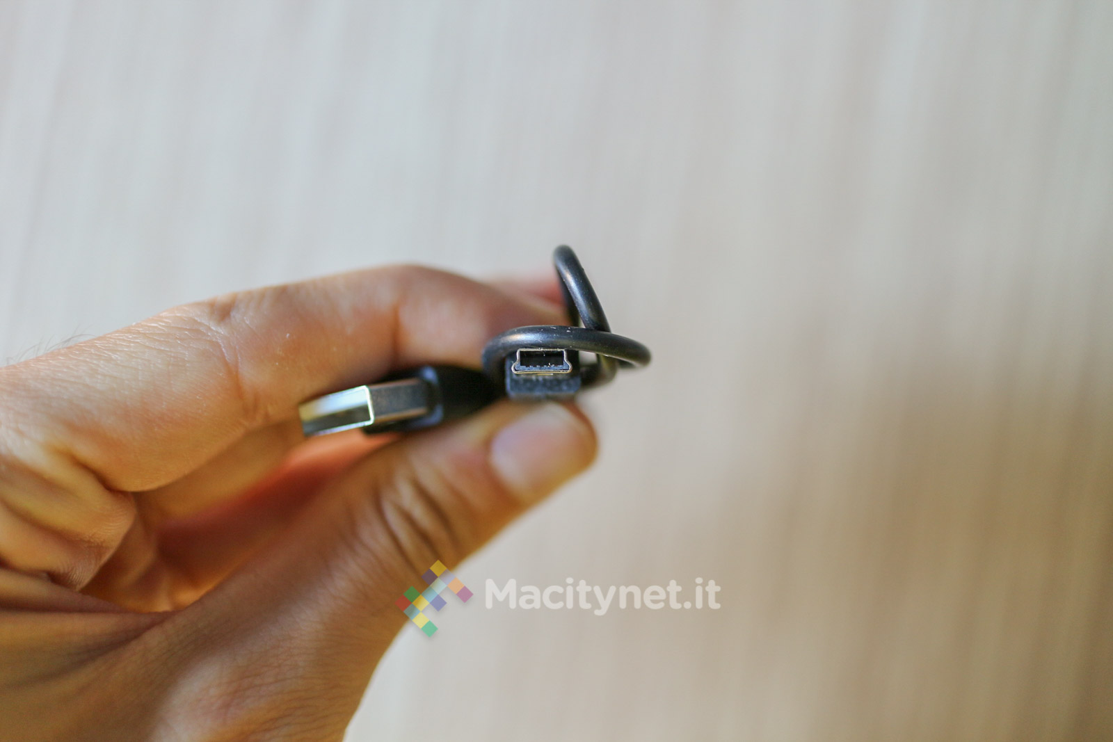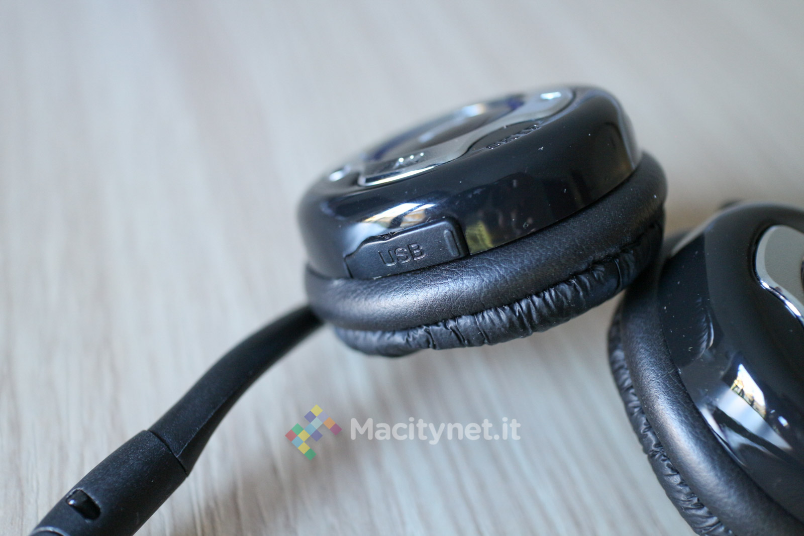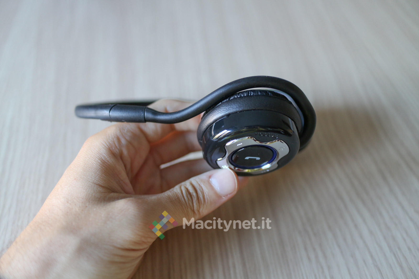 Tutti i controlli si trovano sul padiglione destro: un grosso tasto centrale di forma circolare, contrassegnato dal simbolo di una cornetta, permette di accettare e riagganciare (singolo click) oppure rifiutare (tenere premuto per 2 secondi) una telefonata in entrata, oltre ad avviare e mettere in pausa la riproduzione musicale. Altri due pulsanti, sulla facciata superiore, contrassegnati dai simboli + e -, permettono di regolare il volume, mentre dal lato opposto, FWD e BWD, sono utili rispettivamente per saltare alla traccia successiva o precedente. Sul bordo inferiore troviamo invece l’ingresso miniUSB, ben protetto da un tappo in gomma, utile per ricaricare le cuffie e mantenere protetta la porta da sudore e polvere quando non è in uso.